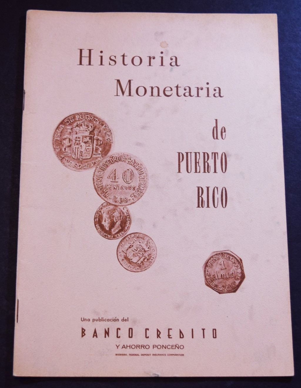 (3) Historia Monetaria de Puerto Rico by Edward H. Roehrs (Ed.). Banco Credito y Ahorro Ponceño. 1964. 12mo. 27 pages. Original tan pictorial card covers. Very Good. unplated. This book is a representative listing of Puerto Rican Riles and coins in the collection of the author. The Riles and coins are listed by hacienda and list denomination, date catalog number and other descriptive information.