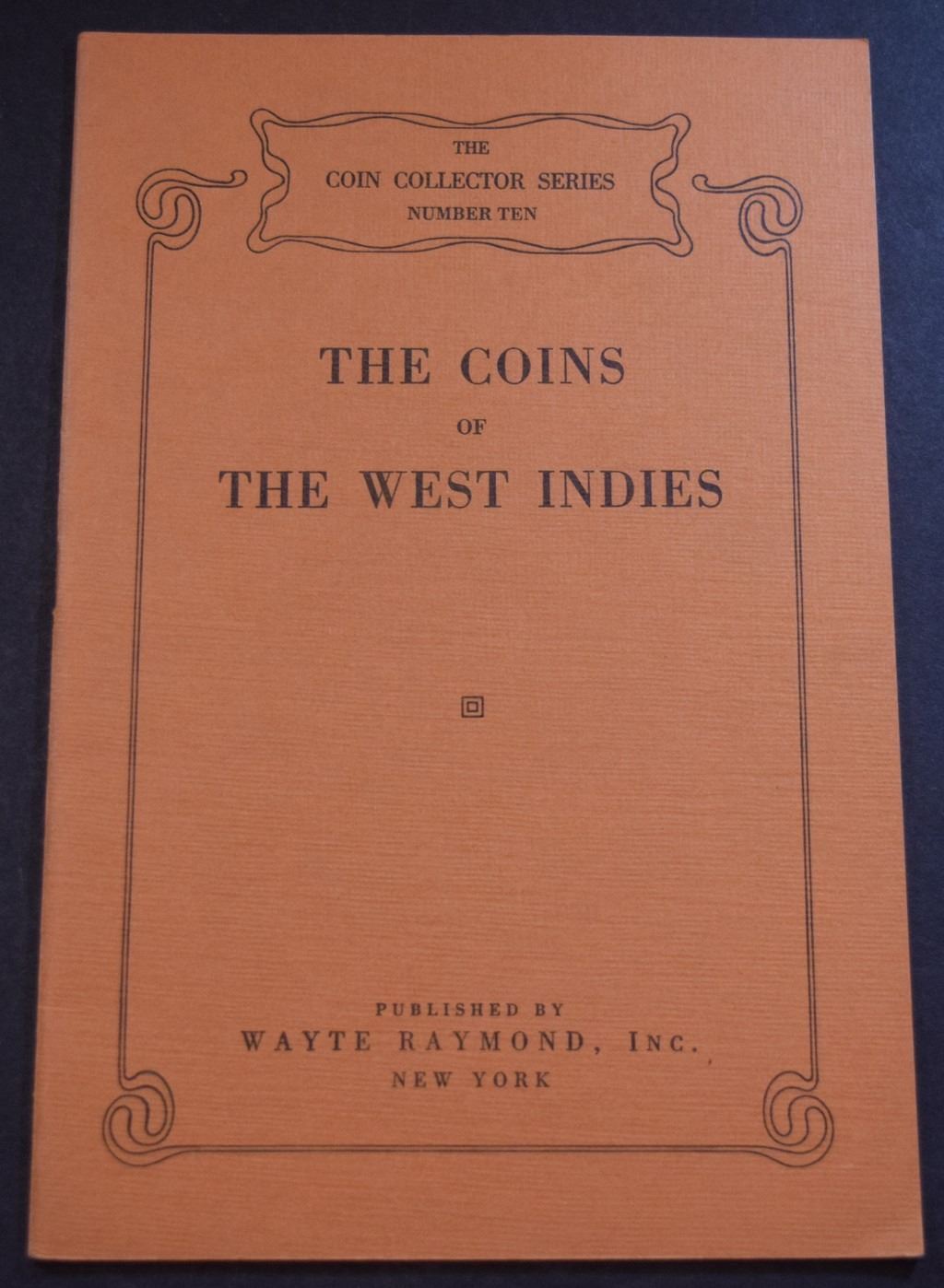 (4) The Coins of the West Indies by Raymond, Wayte. Wayte Raymond, Inc. 1942. 12mo. 24 pages. Original rust printed card covers. Fine. b&w plated throughout. This monograph is from Wayte Raymond's The Coin Collector Series - Number Ten. It is a catalog of coins of the countries that make up the West Indies. Each coin entry is organized by country and has information according to denomination, date, obverse and reverse details, and where included an obverse and reverse photo. The book also covers cut and counterstamped examples.