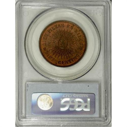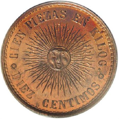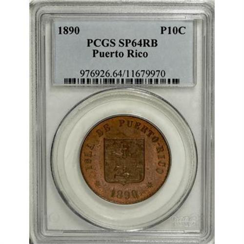 <B>Pattern bronze 10 Centimos 1890,</B></I> KM-Pn1, SP64 RB PCGS, a wonderful example of this rarity, showing almost full original red surfaces (faint remnants of fingerprint on shield side, obverse) and a great design, particularly the radiant sun face on reverse which, like the mythical Italian god of wind, seems to be puffing up his lips to blow the trade winds! However you view it, this is a delightful and very desirable coin.<BR><BR><b>Shipping:</b> Coins & Currency (<a target="_blank" href="http://www.heritageauctions.com/common/shipping.php">view shipping information</a>)