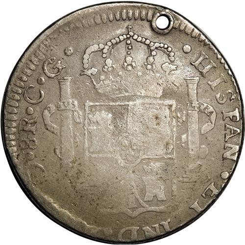 <B>Spanish Colonial. "Fleur de lis" Counterstamp (1884), </B></I>KM13-15 but on a previously unrecorded host coin, Mexico 8 Reales 1819-CG Durango, holed VF. In 1884 silver coins which had been holed were counterstamped the Puerto Rican customs houses to legitimatize them for trade and were subsequently redeemed in 1894. This particular counterstamp punch has long been the subject of controversy, but is unquestionably part of the lore of this series. Ex-Ray Byrne duplicates and the Sturtevant Collection. <B>Sold as is, no return lot.</B></I><BR><BR><b>Shipping:</b> Coins & Currency (<a target="_blank" href="http://www.heritageauctions.com/common/shipping.php">view shipping information</a>)