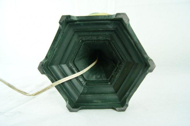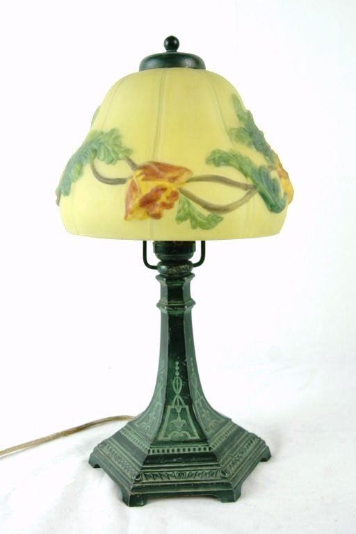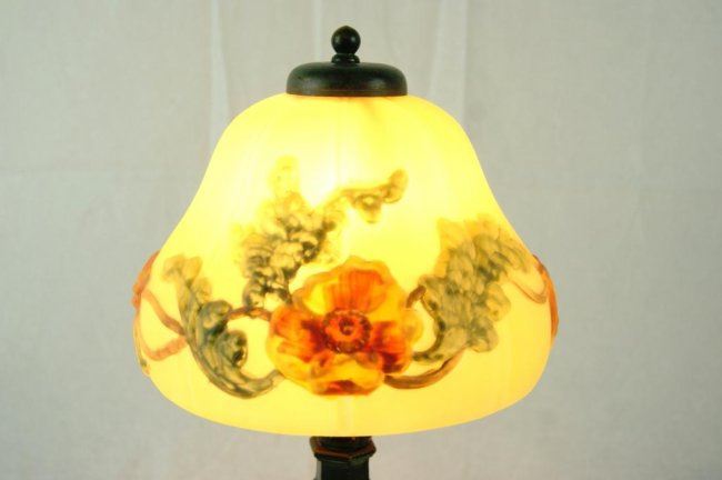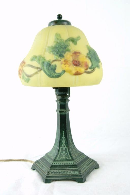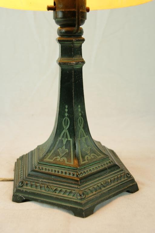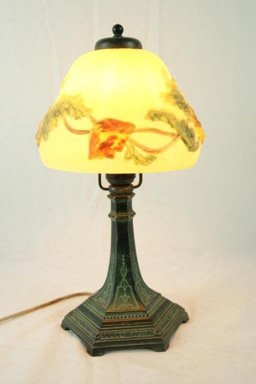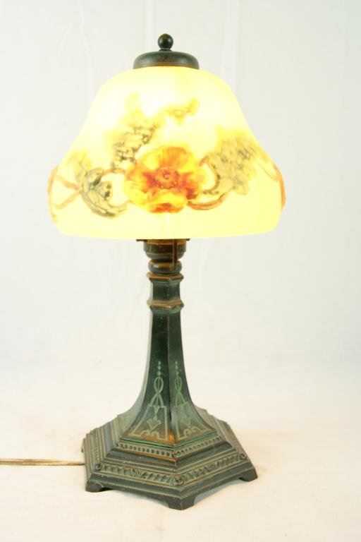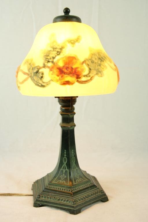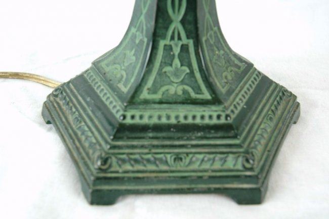 Pierpont ? inverse painted shade with flowers and vines emerging from the shade in relief, the base shows an antique green patina and transitional engravings