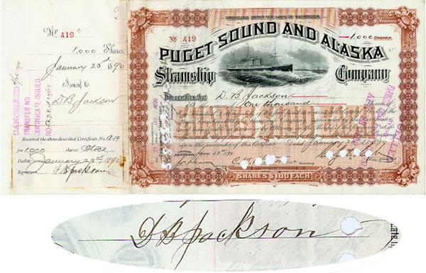 1890, Washington and Alaska. Stock certificate for 50 shares of the the Puget Sound and Alaska Steamship Company. BrownBlack. Lovely engraved vignette of a steamship in rough seas at top center. Printed by Franklin Bank Note Company. Issued to and signed on verso by D. B. JACKSON.