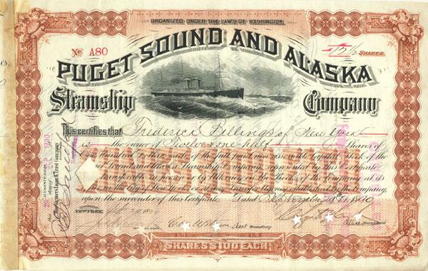 1890, Washington and Alaska. Stock certificate for 50 shares of the the Puget Sound and Alaska Steamship Company. BrownBlack. Lovely engraved vignette of a steamship in rough seas at top center. Printed by Franklin Bank Note Company. Operating from 1889-1904 as a subsidiary of the Northern Pacific Railroad, the company ran a steamship line from Tacoma servicing Puget Sound and Alaska. A number of prominent investors owned shares in this company, including John D. Rockefeller Lightly cancelled. Extremely Fine.