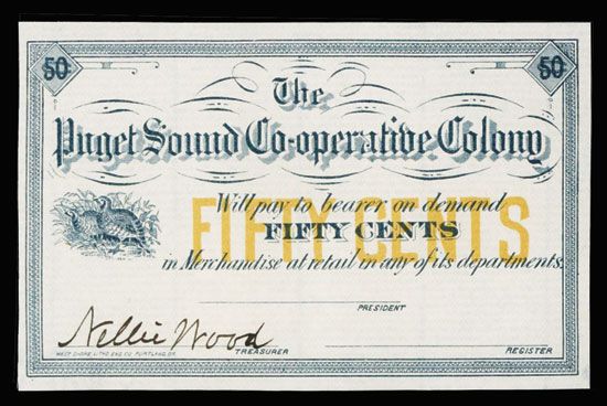 Port Angeles, Washington Territory, ND (ca. 1887), 50 Cents, P-Unlisted, Blue with gold underprint of the denomination ÒFIFTY CENTSÓ, a pair of small quail to the left of the denomination, partially issued and signed by Treasurer ÒNellie WoodÓ with denominations in diamonds on the top left and right corners, measures 3.75 by 2.25 inches, Title in ornate letters on top, Choice AU Condition, The Puget Sound Co-operative Colony was a Utopian collective established at Portland in May 1887 and moved toÊthe mouth of Ennis Creek, Port Angeles, Washington Territory in June of that year. Rare Western Territorial banknote and the first of two being offered in this auction. ÒWest Shore Litho & Eng. Co. Portland, OR.Ó