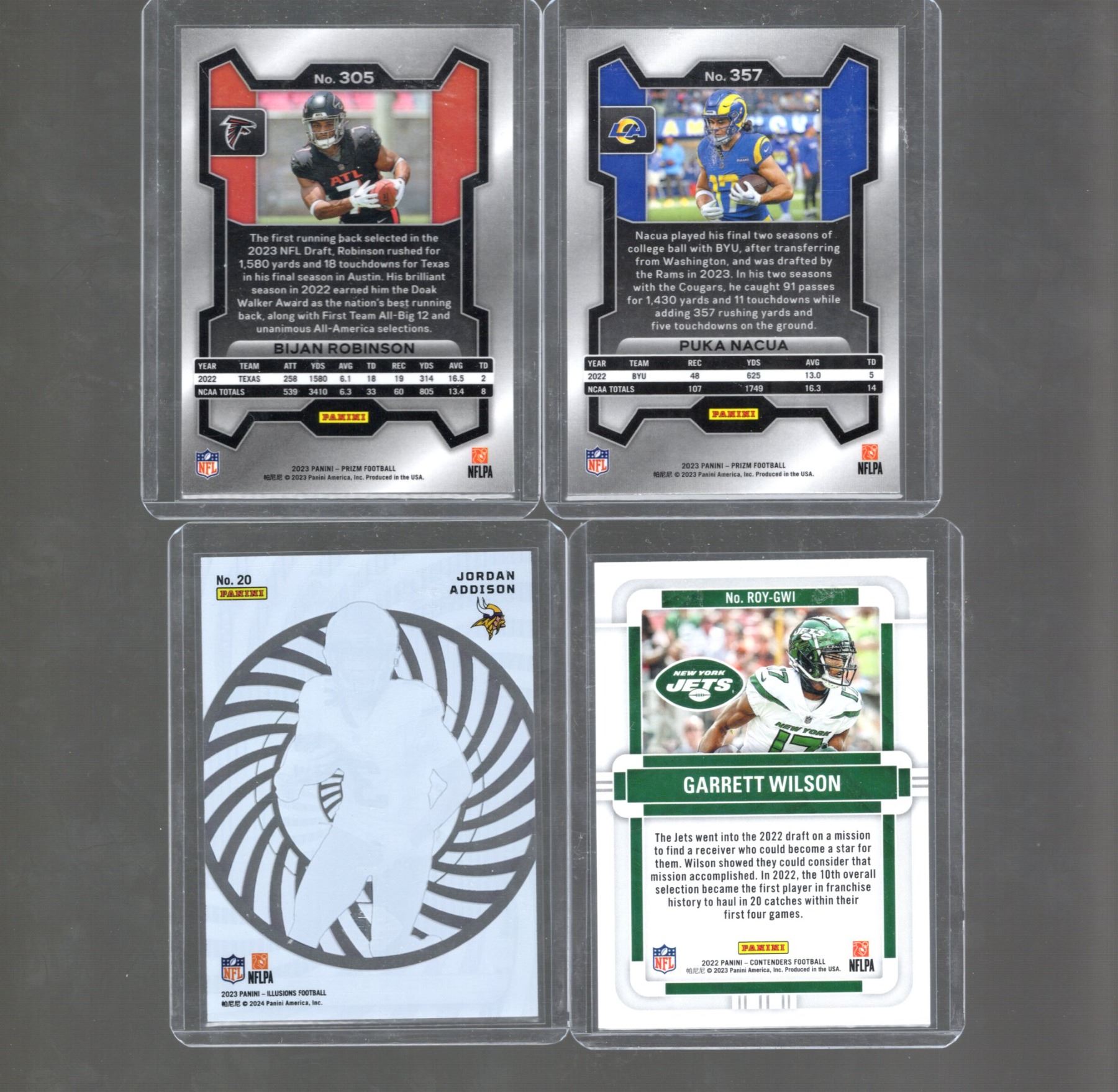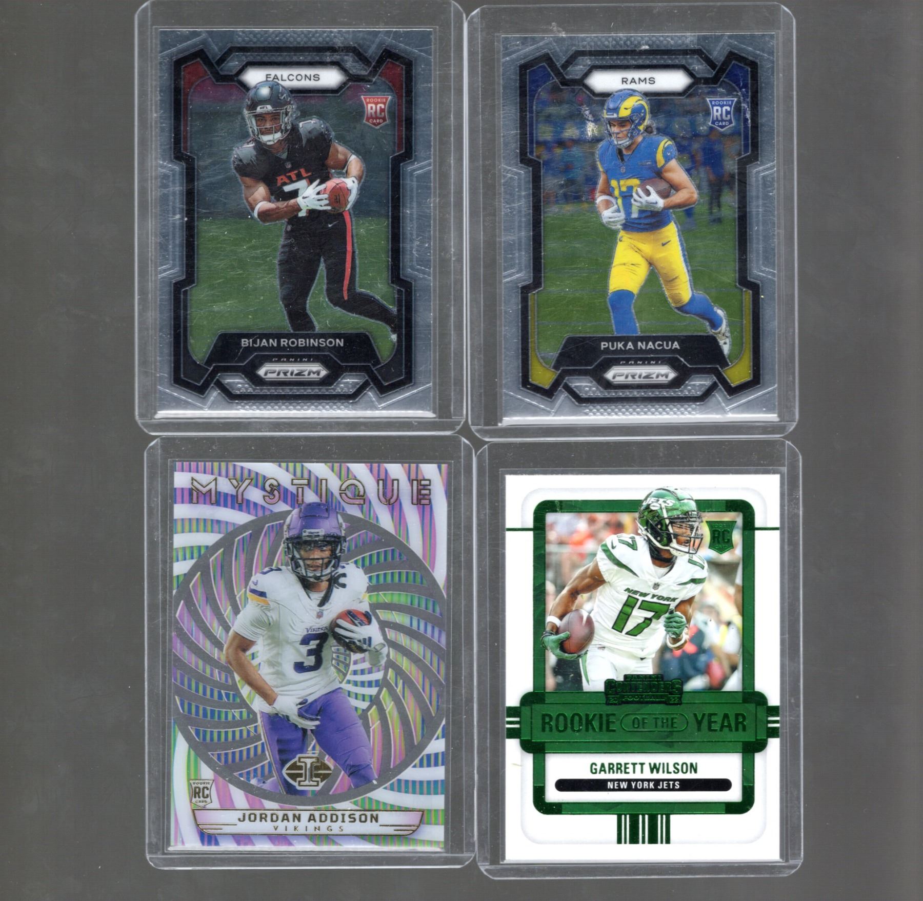 Puka Nacua Prizm RC, Bijan Robinson Prizm RC, Garrett Wilson Emerald RC, Jordan Addison Mystique RC