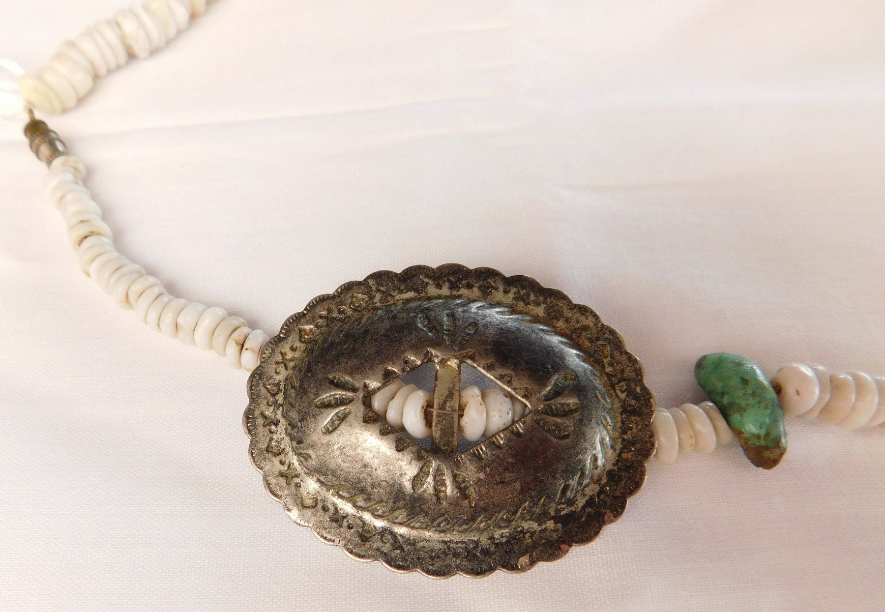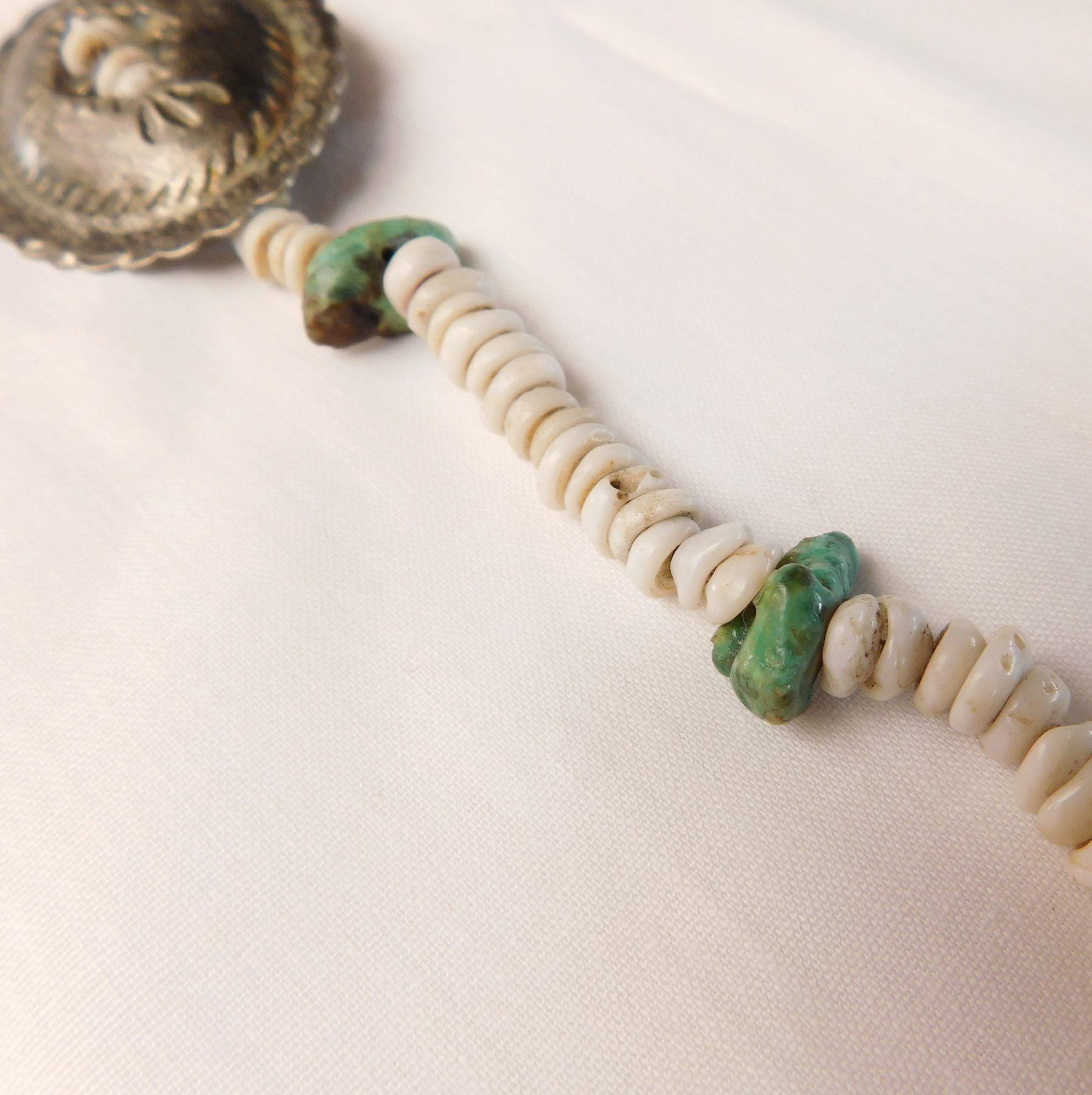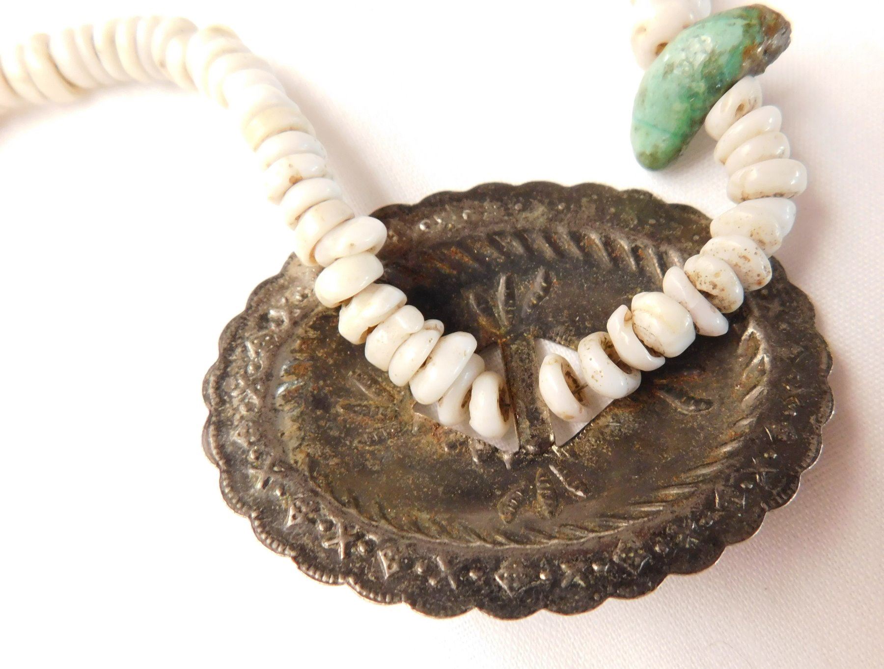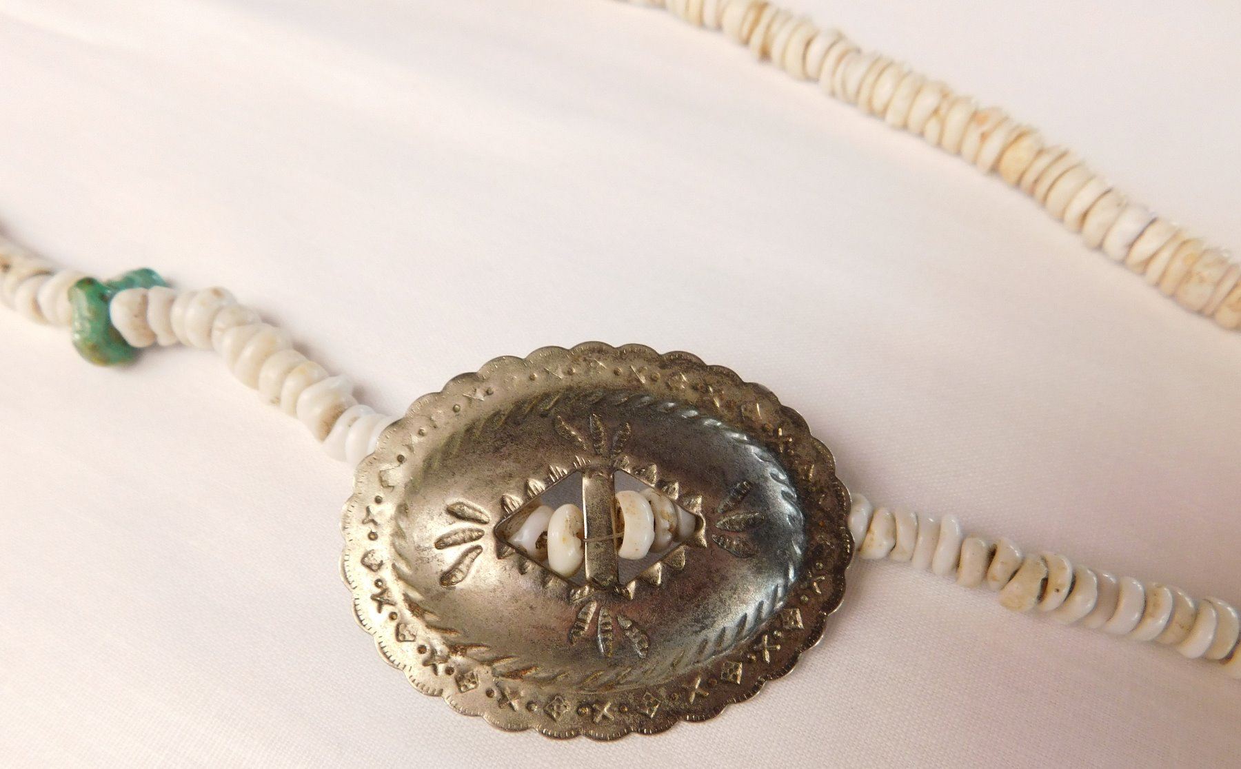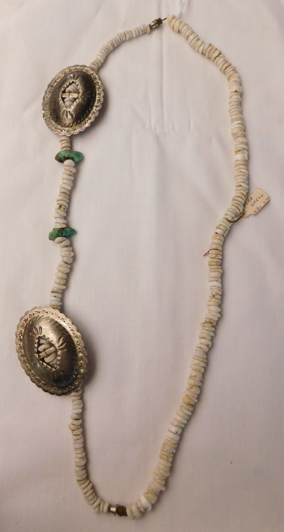 Puka Shell Necklace, c. 1950s. Made of shell, nickel silver and turquoise, the item hangs about 14" as worn. Pacific Islands. Condition: Some wear and patina, see images. Shipping: $12.50 w/insurance and signature.