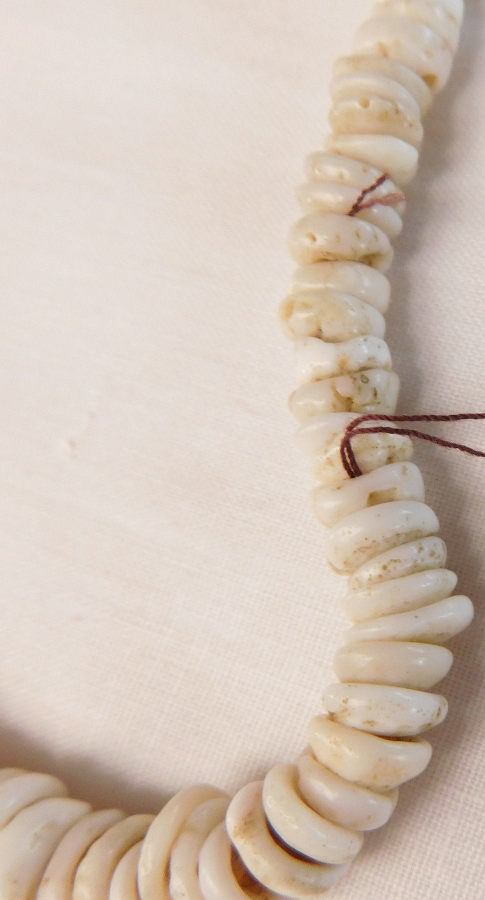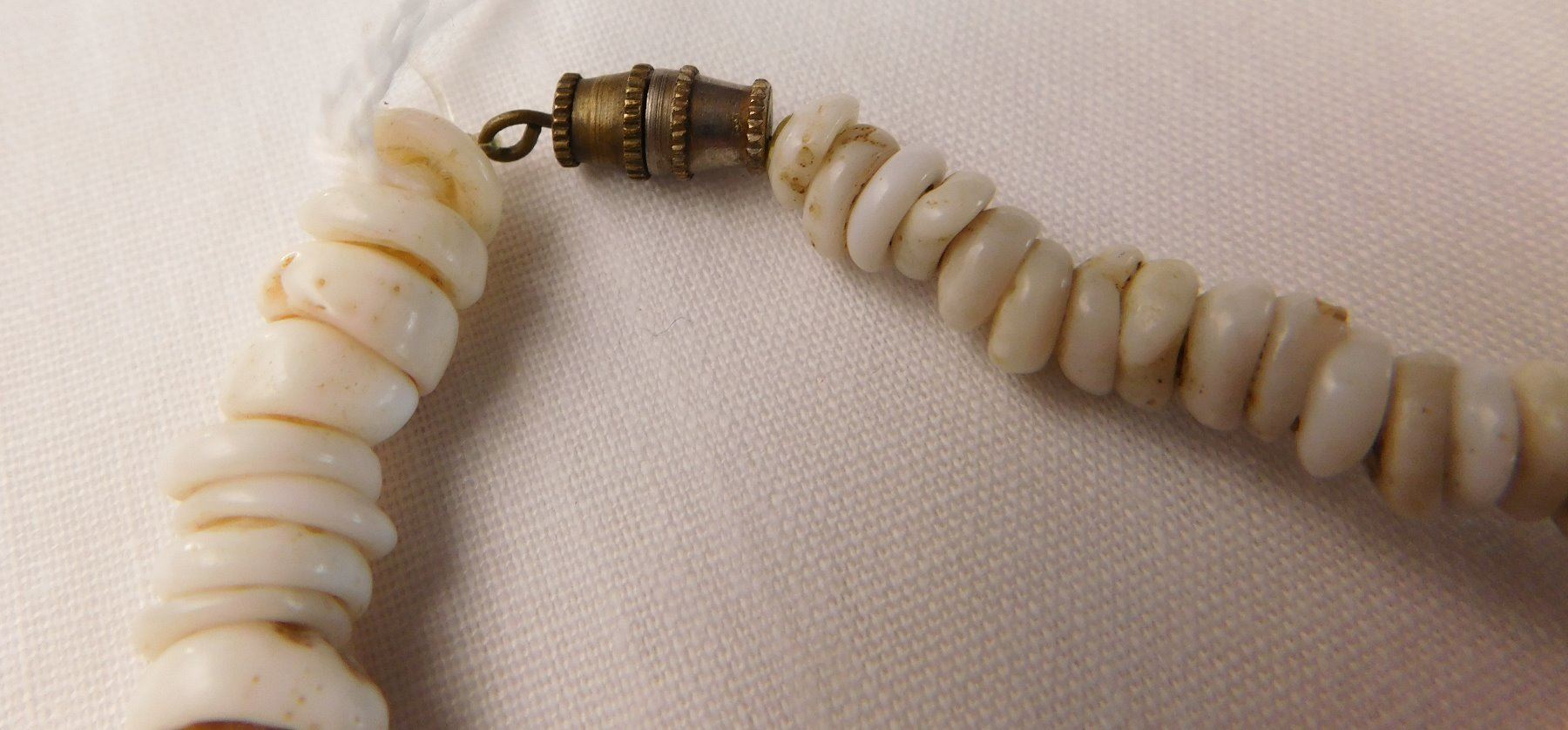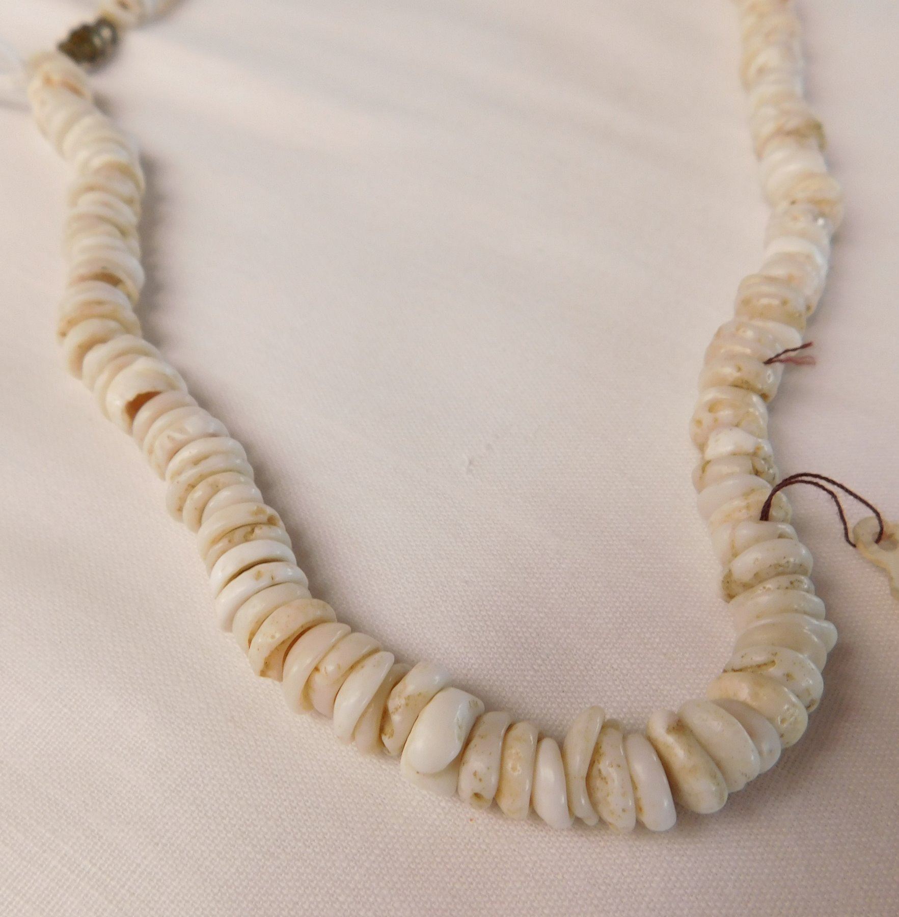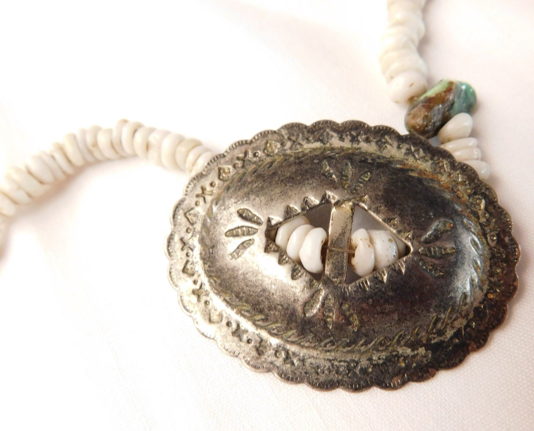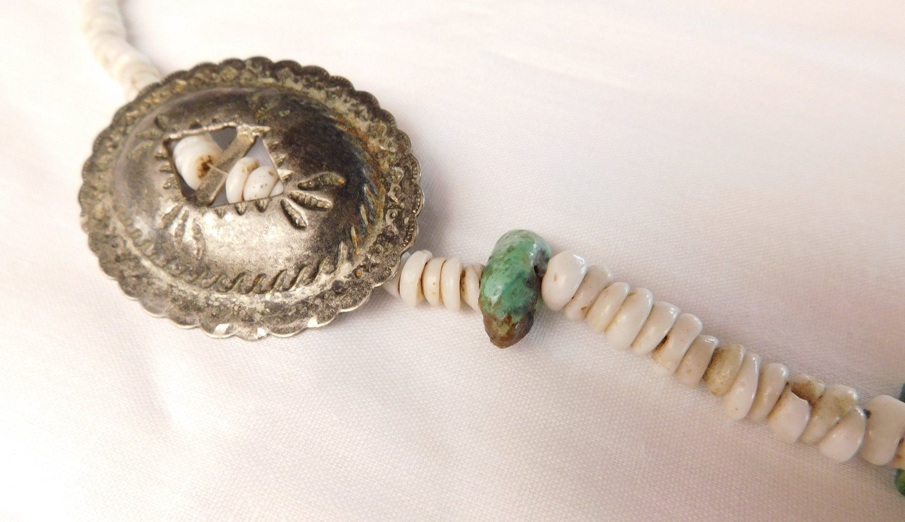Puka Shell Necklace, c. 1950s. Made of shell, nickel silver and turquoise, the item hangs about 14" as worn. Pacific Islands. Condition: Some wear and patina, see images. Shipping: $12.50 w/insurance and signature.