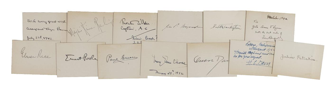 Vintage ink signatures of 13 Pulitzer Prize winners on individual off-white 3.5 x 2.5 cards. Signer are: Thornton Wilder, Booth Tarkington, Elmer Rice, Marjorie Kinnan Rawlings, John P. Marquand, Louis Bromfield (ins), Mary Ellen Chase, Paul Green, Ernest Poole, Owen Davis, H. L Davis, Julia Peterkin, and Margaret Ayer Barnes. In very good overall condition, with scattered mild toning.