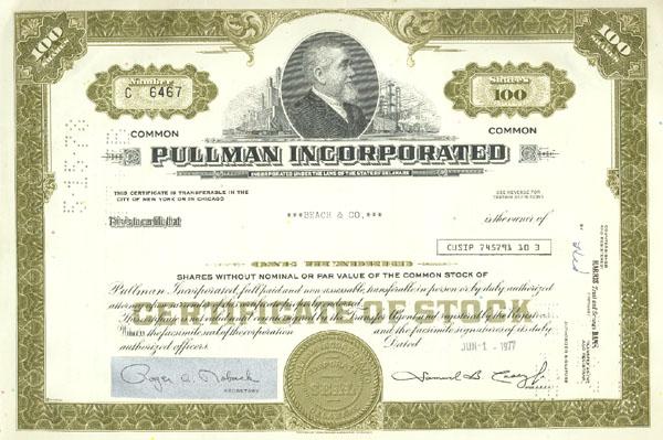 1977. Delaware. Stock certificate for 100 shares. Green/Black. Vignette of George Pullman at top center. Perferation cancelled. Very fine.