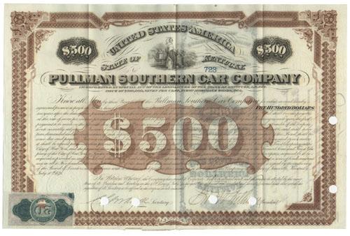 1876, Kentucky. $500 bond bearing 7% interest. Brown/Gray. Engraved vignette of an allegorical figure at top center. Signed at bottom right as President by GEORGE W. PULLMAN (1831-1897). Industrialist; Inventory. Pullman's Palace Car company was organized in 1867 after public acceptance of his "Pioneer" sleeping car. Guided by Pullman's business acumen, the company grew to become the greatest railroad car construction company in the world. Punch cancellations affect signature. Extremely Fine.
