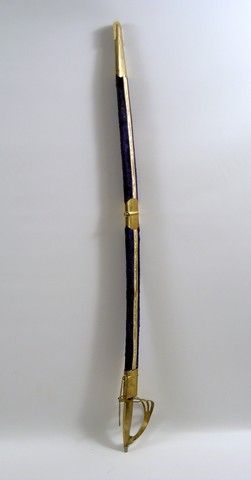 Pulp Fiction Pawn Shop Civil War Sword Prop - It is difficult for anyone to enter a pawn shop after seeing what happens to Bruce Willis and Ving Rhames when they end up in a San Fernando Valley pawn shop in "Pulp Fiction" (1994). This is a metal "Civil War" style sword with purple and gold colored sheath used as one of the plethora of "stuff" that populated the pawn shop and the horror basement below. (Approx. 36" long).