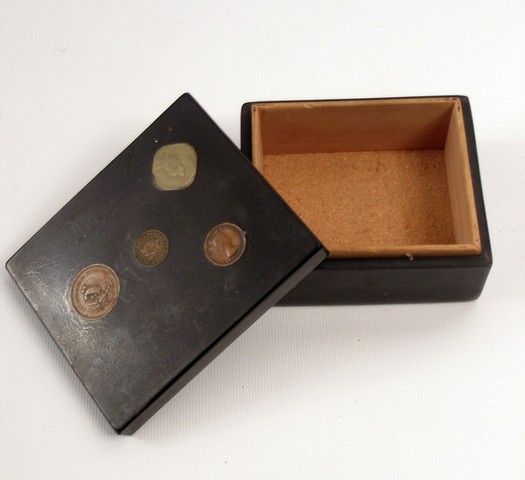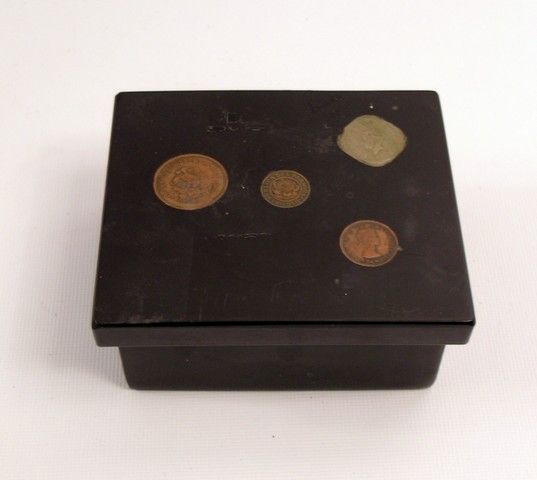 In a movie filled with favorite amazing sequences, perhaps the most remembered from "Pulp Fiction" (1994) is the Pawn Shop. This is a black wood box with embedded antique coins used as background set-decoration in the actual shop. (Approx. 5" x 4").