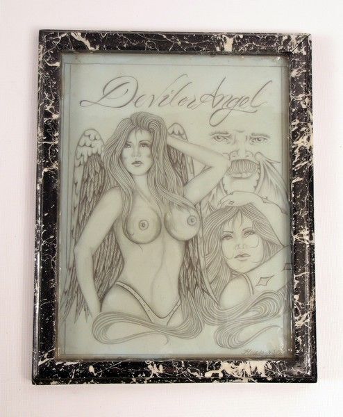 A truly "remarkable" late 1960's biker style pencil drawing entitled "Devil or Angel" a grouping of characters, including a bare breasted angle with wings used as set dressing in the famous Pawn Shop sequence in "Pulp Fiction" (1994). Framed with faux-marble. (Approx. 12 1/2" x 9 1/2").