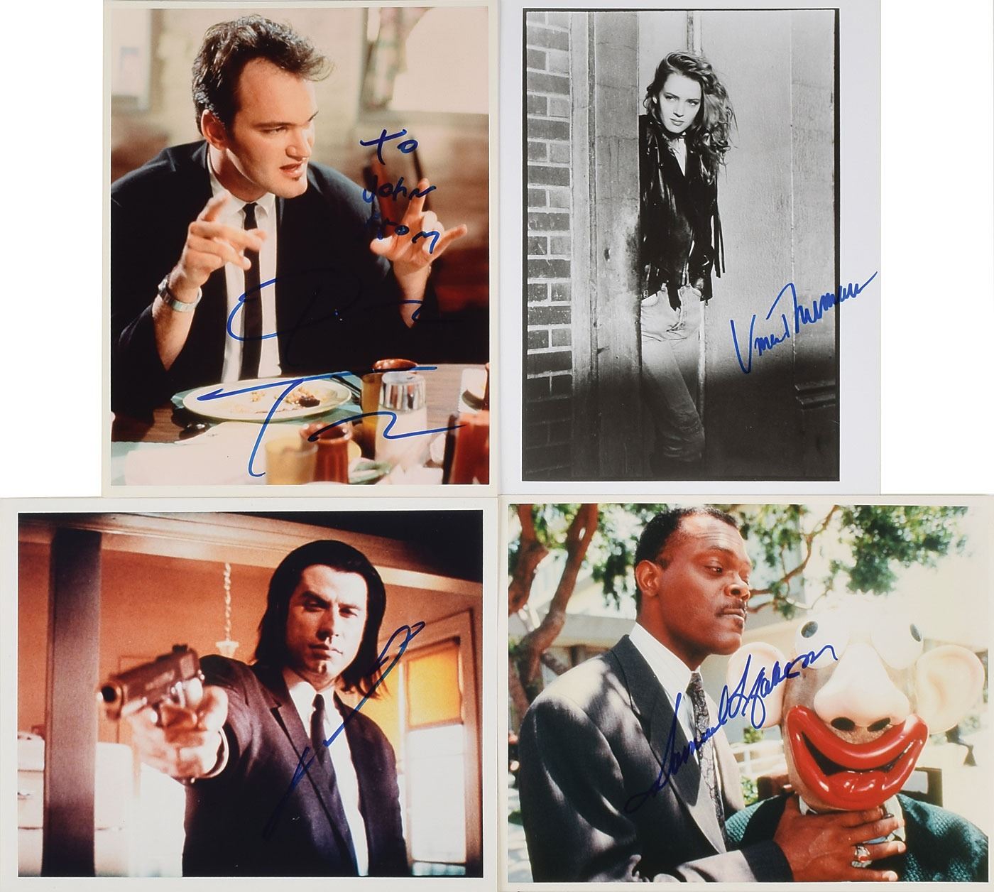 Four glossy photos of actors from the classic 1995 crime film Pulp Fiction, each approximately 8 x 10 and 10 x 8, each signed in blue felt tip by the pictured actor: Samuel L. Jackson, Quentin Tarantino (ins), Uma Thurman, and John Travolta. In overall fine condition.