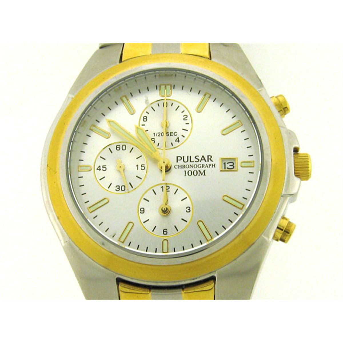 This is a Pulsar Mens Gents Alarm Chrono Watch with the following features: White dial with luminous hands & luminous hour marker batons; Stop watch function with three sub dials; 100m Water resistant; Two tone stainless steel bracelet; Date display window; Gold tone stainless steel case & crown; Hardened scratch resistant mineral glass; and Stainless steel case back