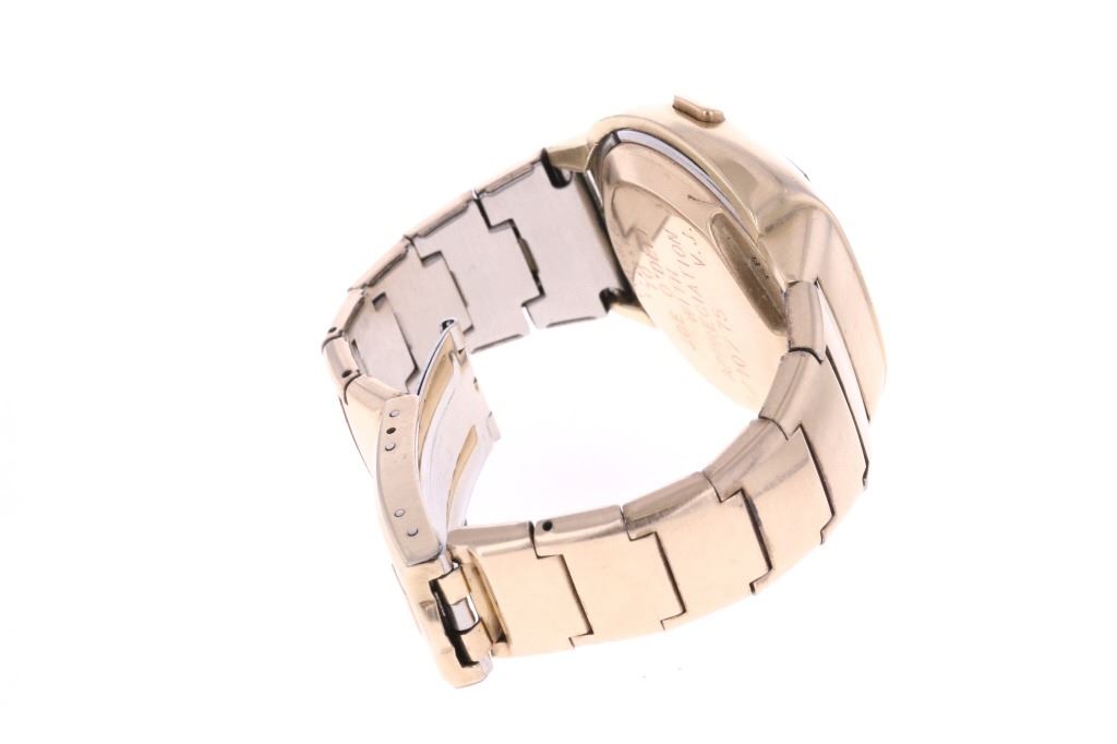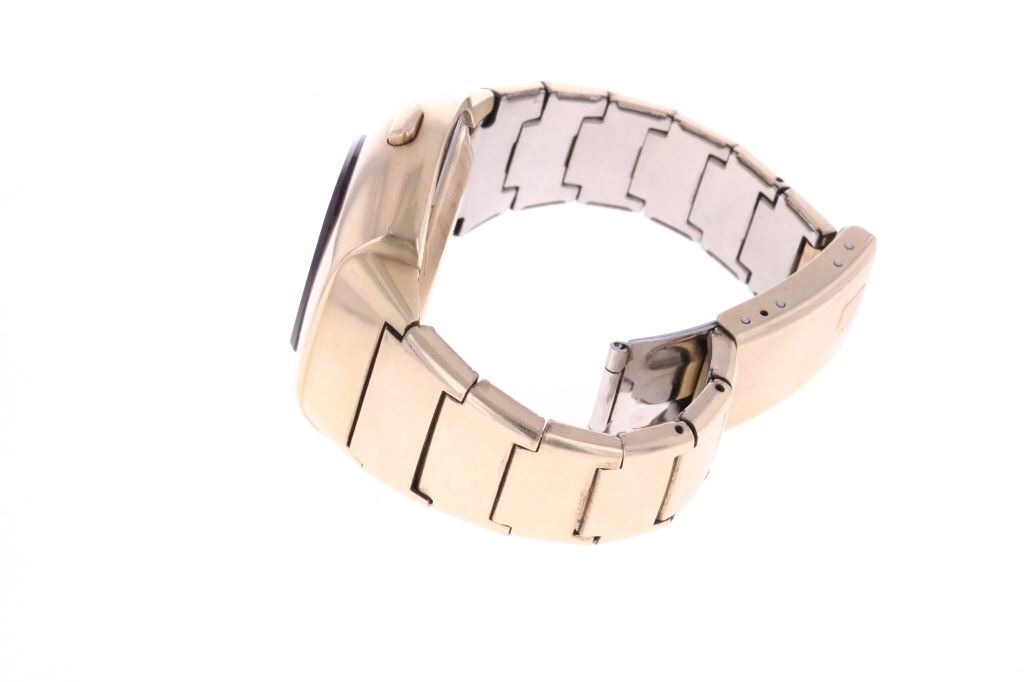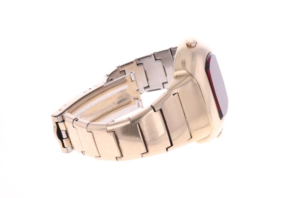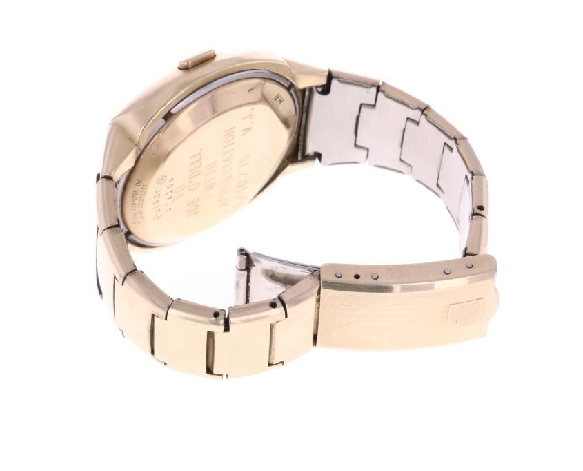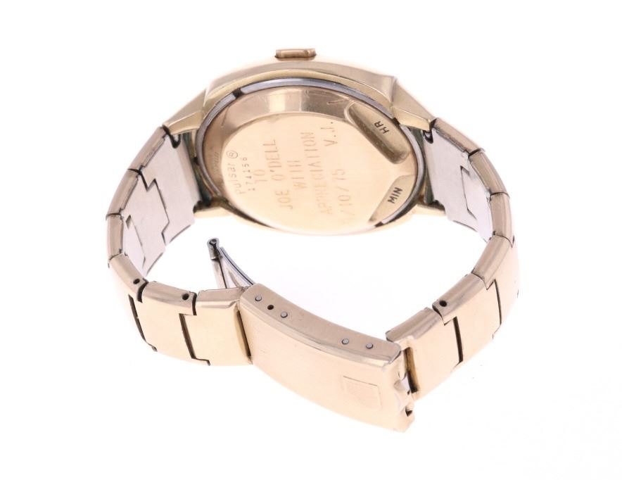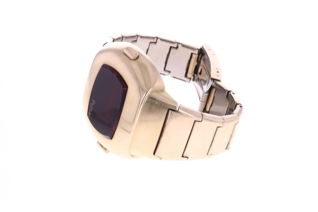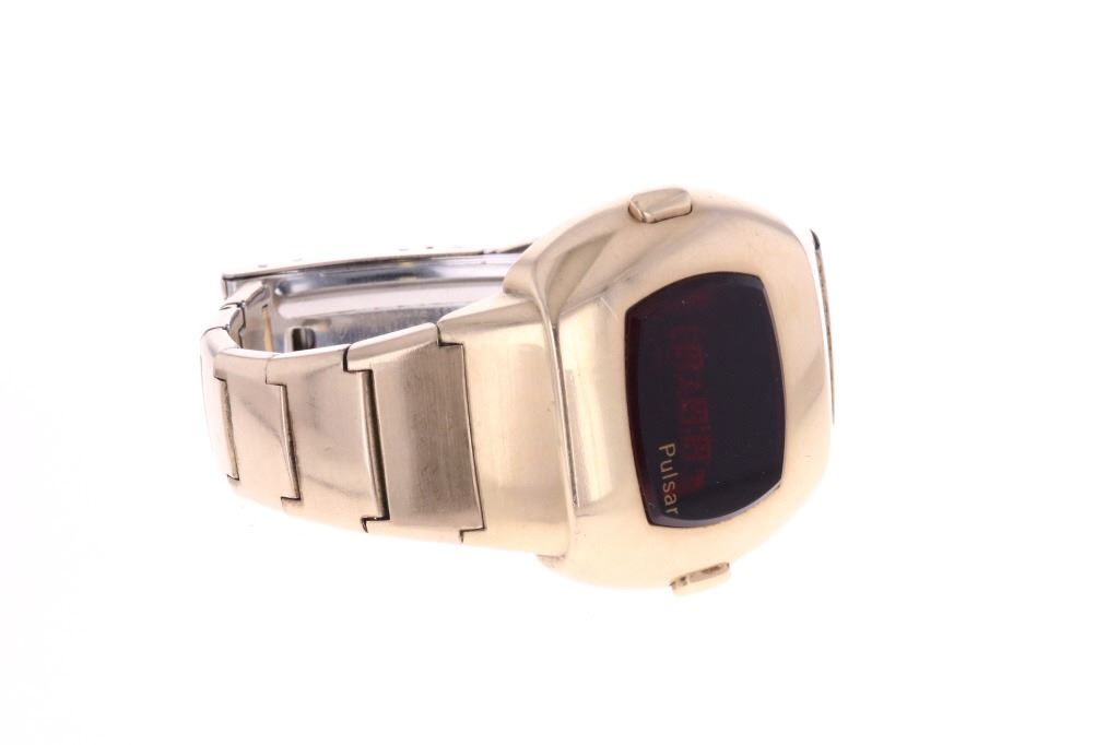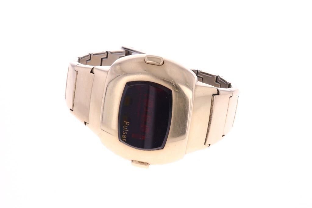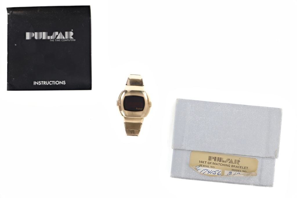 For your consideration is this 1975, Pulsar Model 3120 14K gold filled watch. Launched in 1972 by the Hamilton Watch Co., and created by Bulgarian engineer and NASA scientist Peter Petroff, Pulsar was the world's first electronic digital watch, featuring a revolutionary LED display with no moving parts. This watch features a 14K gold fill watch face and 10K gold fill trim & stainless steel watch band. The watch face shows a black plastic cover over the LED lights and reads, "Pulsar". The back of the watch has been engraved reading, "To Joe O'Dell With Appreciation 5/10/75 V.J.". The back of the watch also reads, "© Time Computer Inc. 14K Gold Filled / Pulsar ® / 174156" while the watch band reads, "©Time Computer Inc. / 10KT G.F. Trim / Stainless Back, U.S.A.". It comes with its original, silver colored box as well as its original Pulsar introduction and instruction booklet. The watch measures 3 1/8" L x 1 3/4" W with an interior circumference of approximately 6 1/8". It has a total weight of 87.6 grams. The box measures 4 3/8" L x 5 7/8" W x 3 1/4" H. It has not been tested for working condition.