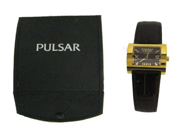 This is a Pulsar Watch with leather strap with the following features: Gold tone bezel; leather strap with gold tone buckle clasp; Gold tone push/pull crown; stainless steel; brown dial with gold tone markers and hands; and Stainless steel