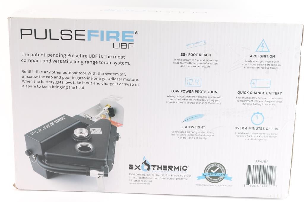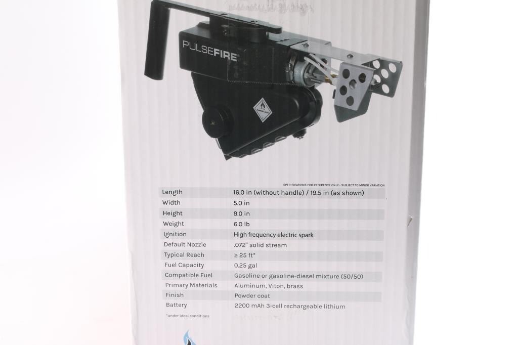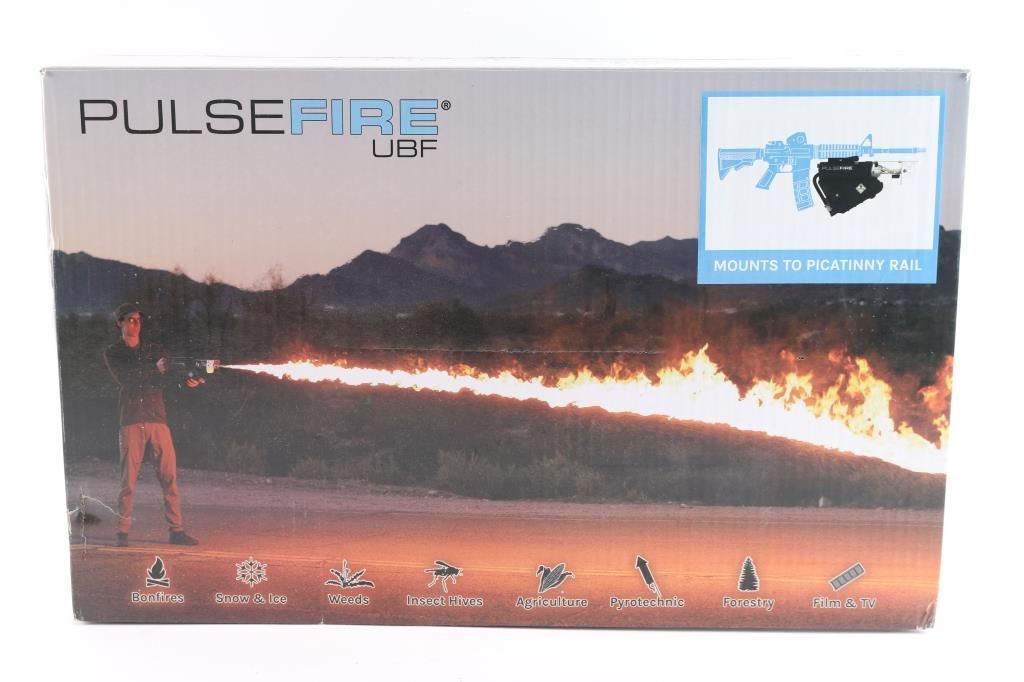 Chinese made Under Barrel Flamethrower (UBF) designed to attach to a picatinney rail and to bring the heat. It utilizes a high frequency electric spark to ignite a solid stream of gasoline or gasoline/diesel mixture (50/50). A 2200 mAh 3-cell rechargeable lithium battery keeps things lit, and shooting flames approximately 25 feet. The flamethrower is constructed from aluminum, viton, and brass with a black powder coat finish. It comes with a .25 gallon fuel capacity, and is compatible with the Pulsefire 3.3 gallon backpack which can provide up-to four minutes of fire. This item comes in its original sealed box.