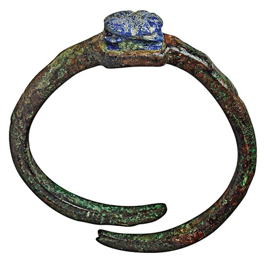 Pulsera decorada con un escarabeo. Baja época (alrededor del 664-323 a.C.). Bronce y pasta vítrea azul cobalto. Diámetro 5,4 cm. Bonita pátina.