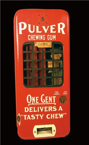 Pulver Chewing Gum Dispenser, porcelain with policeman and original decal. Quarter size chip at 11:00 otherwise excellent original condition. Key included. 9 X 20 1/2 inches.