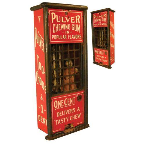 Pulver Chewing Gum Dispenser, porcelain. Red version with yellow kid. Some rust on the steel and minor chips otherwise very good condition, comes with key. 9 1/2 X 24 1/2 x 6 inches.