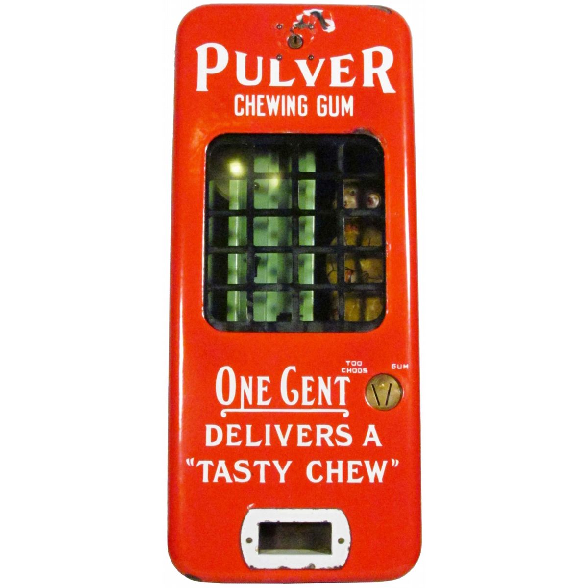 Pulver Red Porcelain Gum Vendor with Yellow Kid. A couple of chips otherwise very good all original working condition, with key. 19 X 21 X 4 1/2 inches.