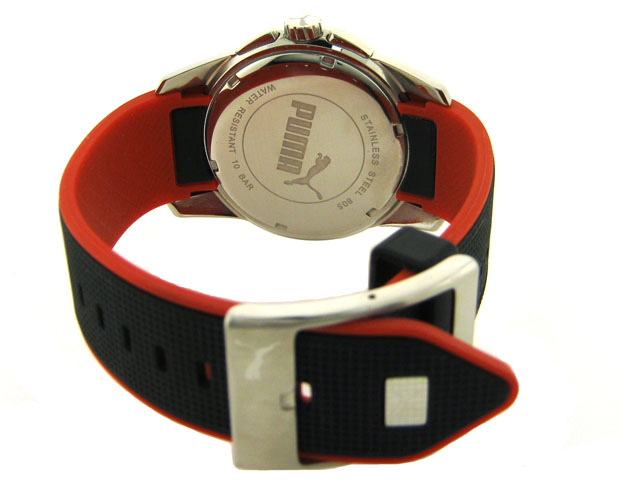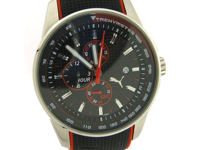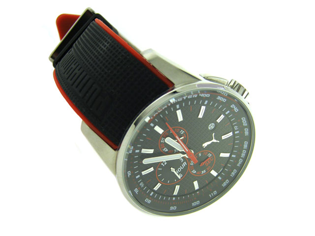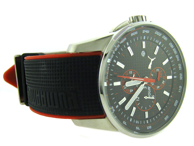 The watch has the following features: Quartz movement; Stainless steel case with clasp buckle; 38 mm Case diameter; Polyurethane band; Mineral Crystal; Black Dial; Chronograph functions; and Water resistant.