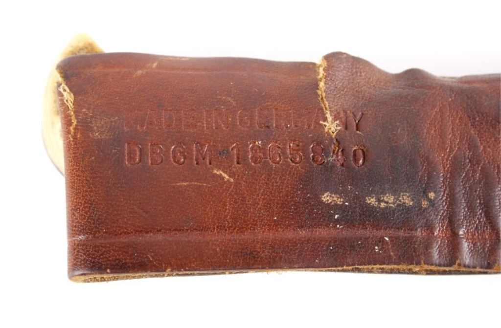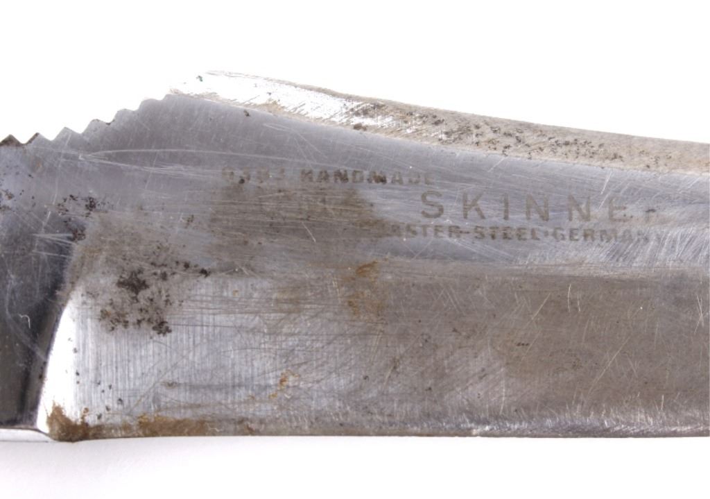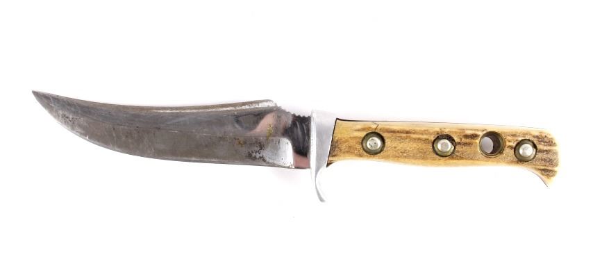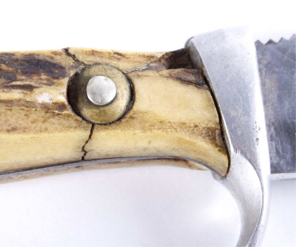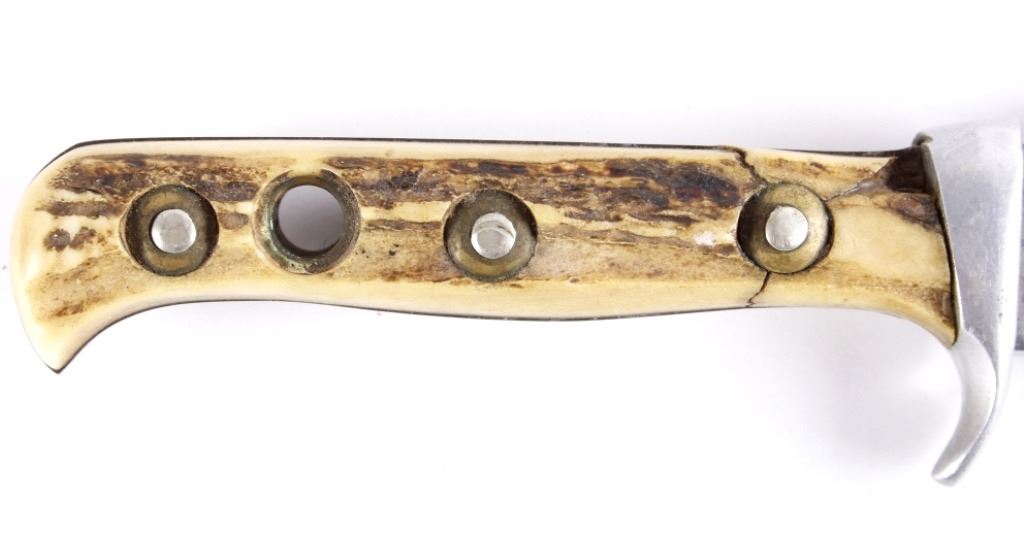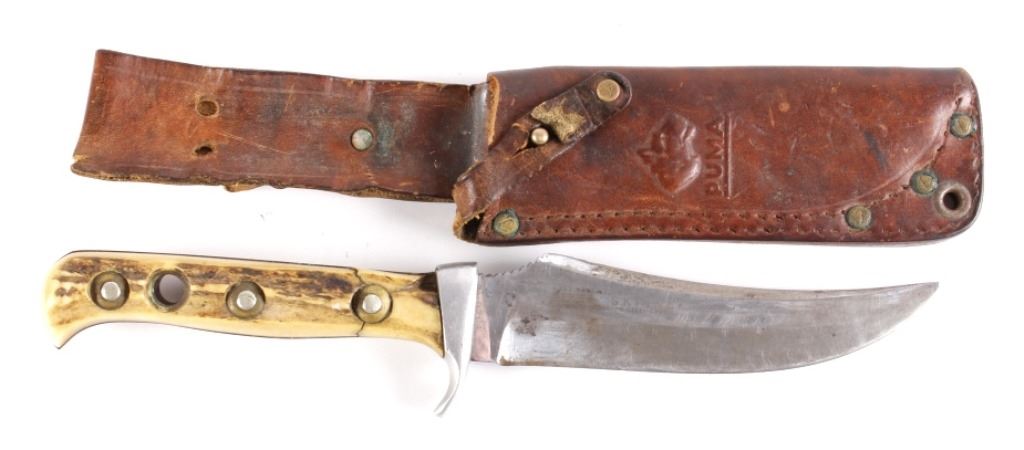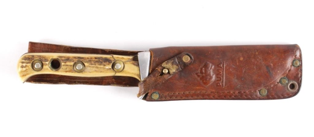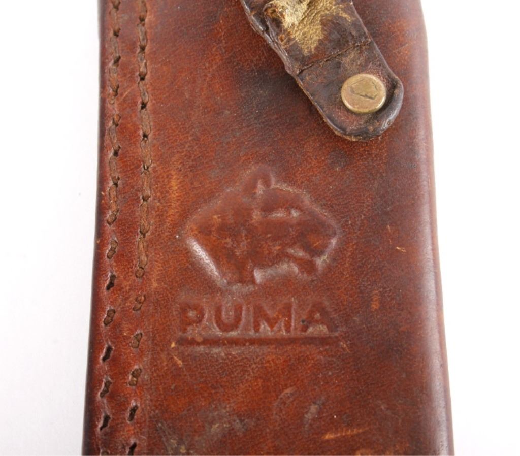 Available for bidding is a handmade knife, manufactured out of Germany by "Puma". The knife shows a 5" trailing point blade, with a thick stag handle. The knife reads on the right side of the blade; "6393 Handmade - Puma Skinner" followed by some illegible script, and finished off with "Master - Steel - Germany". The knife also boasts an ergonomical index finger guard, with a serrated thumb pad on the back rib of the blade. The scabbard for the knife shows dark leather construction, and reads "Puma" across the front, and "Made in Germany" on the back. The knife shows fair condition, there is some obvious wear from regular usage, the script on the blade is somewhat worn off, and there is a crack in the stag handle. When inserted into the sheath, the knife measures 9 5/8" long, 1 3/4" wide, and 1 1/4" thick.