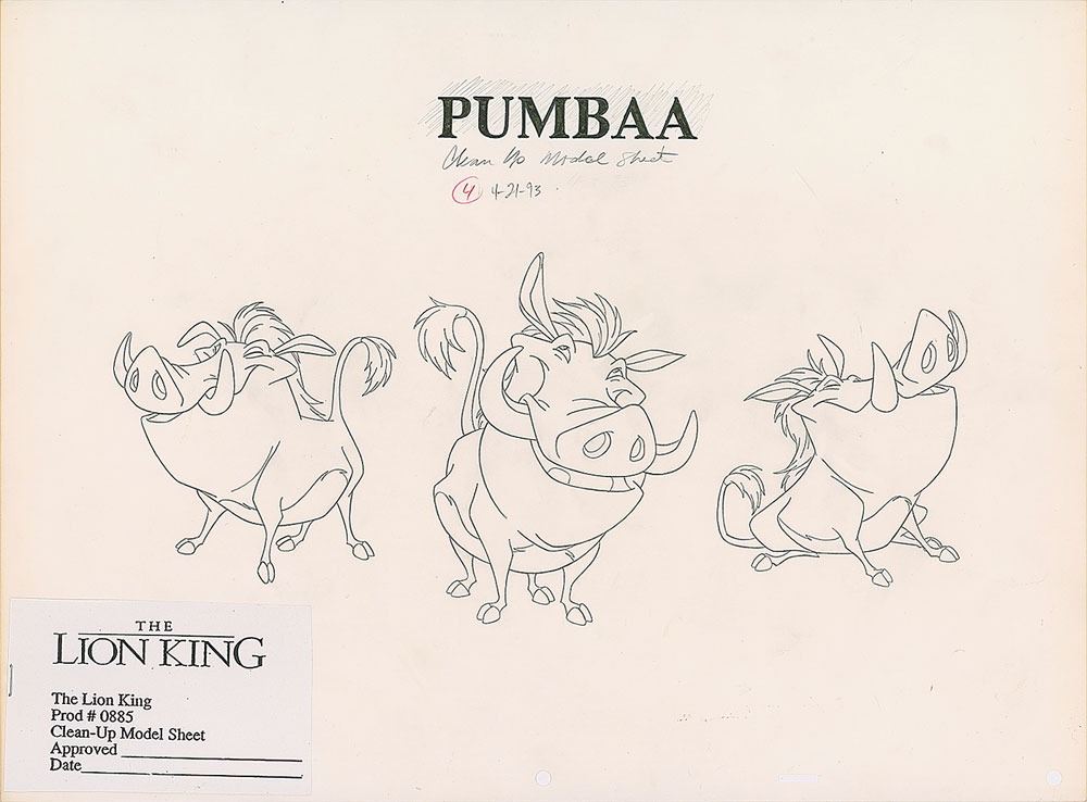 (Walt Disney Studios, 1994) Original clean-up model drawings of Pumbaa from The Lion King, accomplished in graphite on untrimmed 17 x 12.5 animation paper. An identification label is stapled to the lower left. In fine condition.