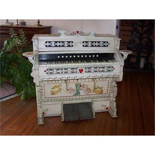 Late 19th C. Hand-Painted Pump Organ. Estey Organ Co., Brattleboro, VT, Circa 1890. Hand painted in late 1950 by Swedish Artist Mrs. R. Longsweiler (original paper stencils are available). Shakespeare's first line "If music be the food of love play on" is hand painted on top board. Original keys and 11 wood pulls above keys for special sound features. Good working condition with original bellow construction.