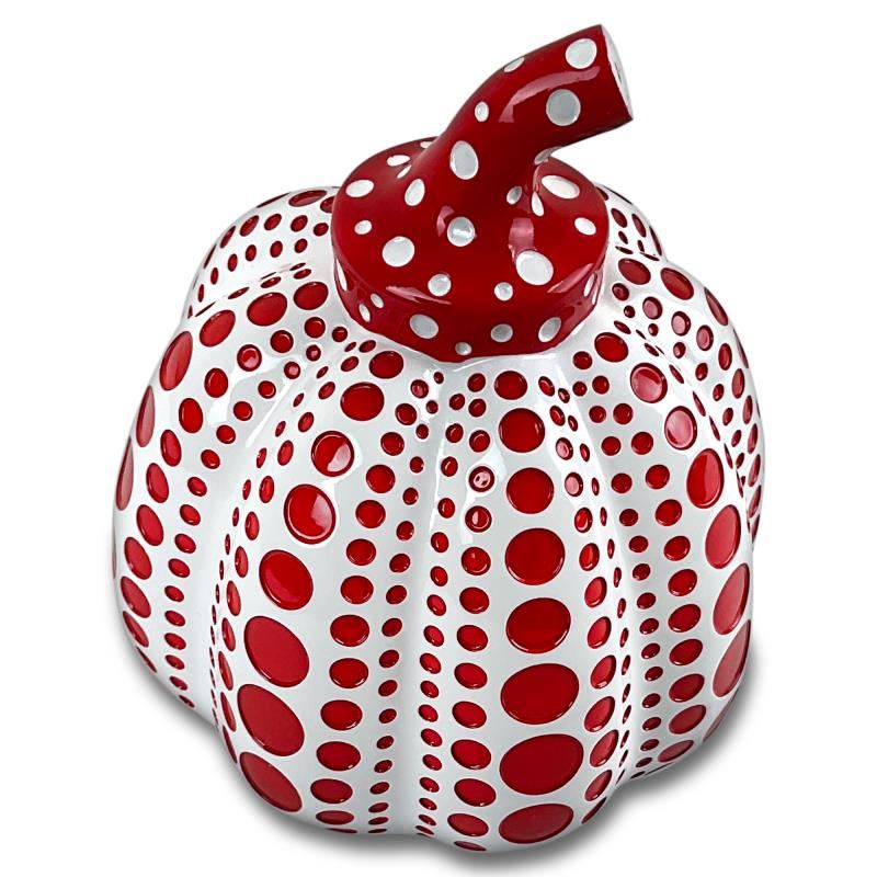This is a lacquer-painted resin pumpkin sculpture (red) by Yayoi Kusama. This piece is new in the original box. Includes Letter of Authenticity. Measures approx. 3" x 4.5" x 4.5".