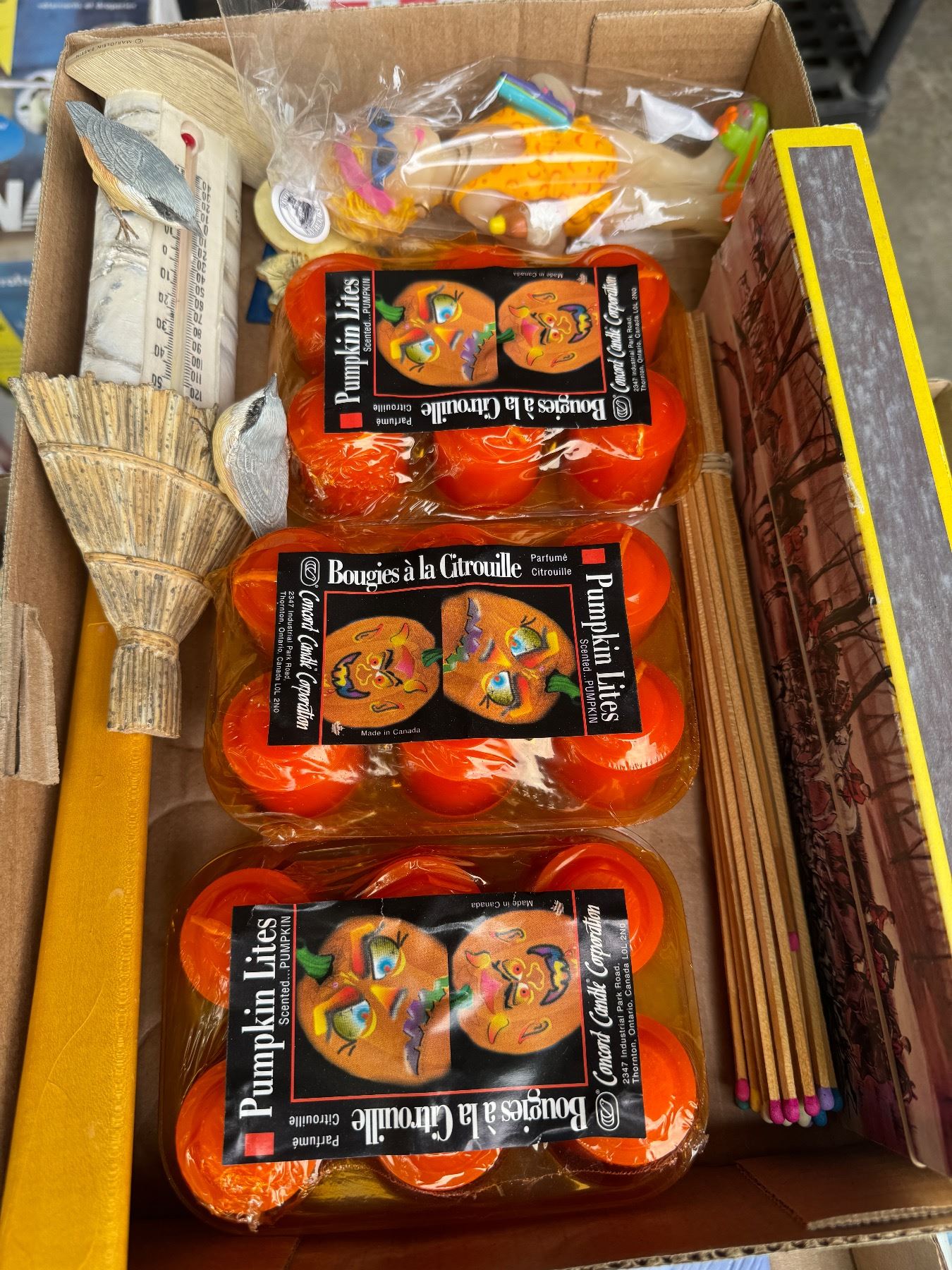 Pumpkin lights, thermometer, matches, etc.