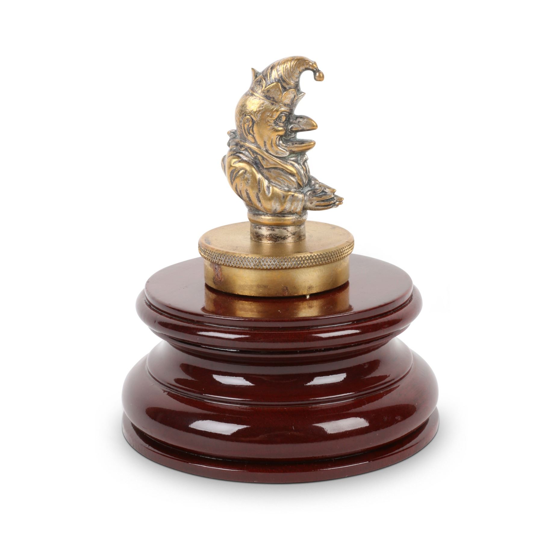 Hood ornament. Mounted on custom-turned pedestal.. 4" x 4" x 5". Patinated surface. 150-250.