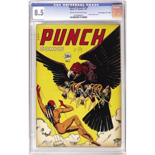 <B>Punch Comics #20 Davis Crippen ("D" Copy) pedigree (Chesler, 1947) CGC VF+ 8.5 Cream to off-white pages.</B></I> This classic sports a unique cover with bare breasted women. This one is notorious, and Gerber lists it as "uncommon" in its scarcity index. This is also the highest-graded copy certified by CGC to date. Overstreet 2006 VF 8.0 value = $600; VF/NM 9.0 value = $950. CGC census 7/06: 1 in 8.5, none higher. <I>From the Crippen Collection.</B></I> <BR><BR><B>Important notice:</B> Heritage usually auctions material at the rate of 200-250 lots per hour. On some occasions eBay Live bid software or the Internet may not be able to keep up with the pace of the auction. We recommend placing a realistic absentee bid now as insurance to avoid disappointment. Occasionally the auctioneer may eliminate or reject an eBay Live bid, and the auctioneer may also reopen a lot after the close of the eBay live bidding (usually because we missed an audience bid), and may reject your bid even if it shows you as the winning bidder. By bidding via eBay Live, you agree that Heritage may award the lot to another bidder at its sole discretion under the circumstances described above or any other reasonable circumstances. Since eBay bids are not shown to us until we open the lot on the floor, we treat those bids just like floor bids. In most cases the floor responds before the eBay bid is presented to us, due to Internet lag time, so for consistency we have made it a policy that floor bids are always considered first over tie eBay live bids. Also please note that all Heritage lots purchased through eBay Live carry a 22.5% Buyer's Premium. Please make sure you read the Terms and Conditions before you bid. This lot is being auctioned in conjunction with a live floor auction by Heritage Auction Galleries. All final auction and invoice information will be supplied by Heritage Auction Galleries, and all other information should be considered preliminary. Lot:41001 <BR><BR><B>Winning Notification and Billing:</B> After the FINAL session in this auction is complete, Heritage will send e-mail and snail mail invoices. This process normally takes several days. All final auction and invoice information will be supplied by Heritage Auction Galleries, and all other information should be considered preliminary. <BR><BR>This auction will be conducted on a live auction floor and over the Internet through eBay Live. If you choose to place an absentee bid, please take a moment to <font color='#0000ff'><u><a href='http://pages.ebay.com/liveauctions/help/before/laabsentee.html'>learn how eBay Live absentee bidding works</a></u></font><font color='#000000'>