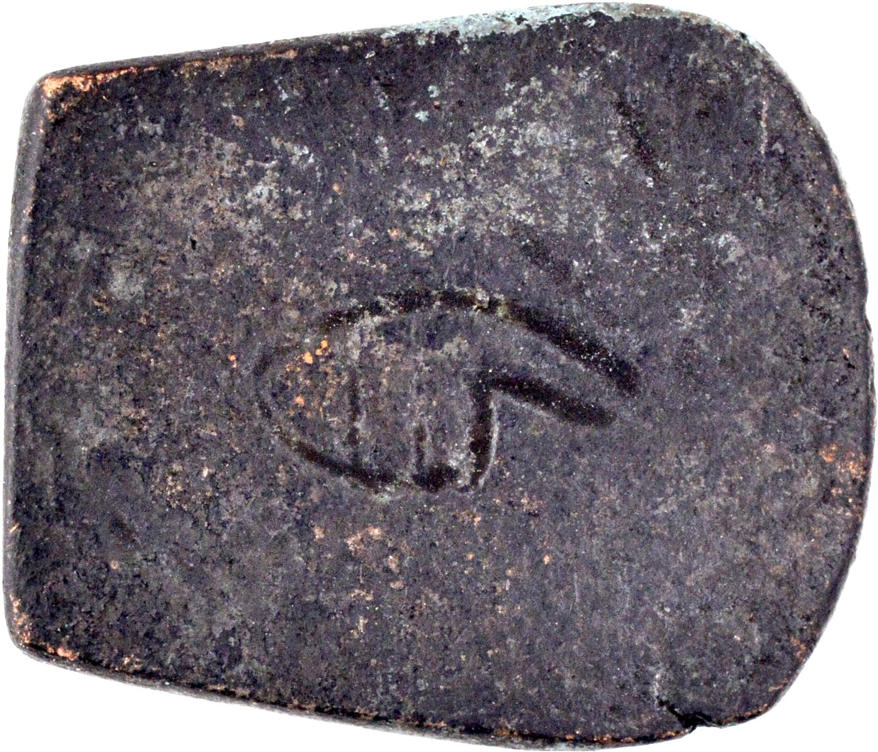 Punch Marked Coin, Post-Mauryan, Bengal-Chandraketugarh Region (200-100 BC), Copper Karshapana, Obv: three punch marks including a spoked wheel, two circles enclosing dots, six dumbbells around, and a boat (representing riverine trade-in Bengal), Rev: a single punch mark comprising a conch shell (Shankha), 2.19g, 14.4x124mm, (Hardekar, 2019 # BR 20), choice very fine, Scarce.