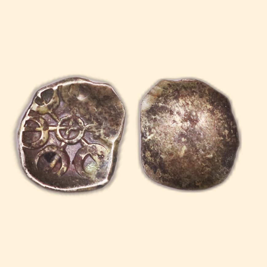 Archaic Coinage, Punch Marked, Gandhara Janapada (c. 600-400 BC), Silver 1/8 Shatamana, 1.00gms, OBV: Six arms symbol with closed circles, Uniface, (Rajgor # Series 41). Very Fine.