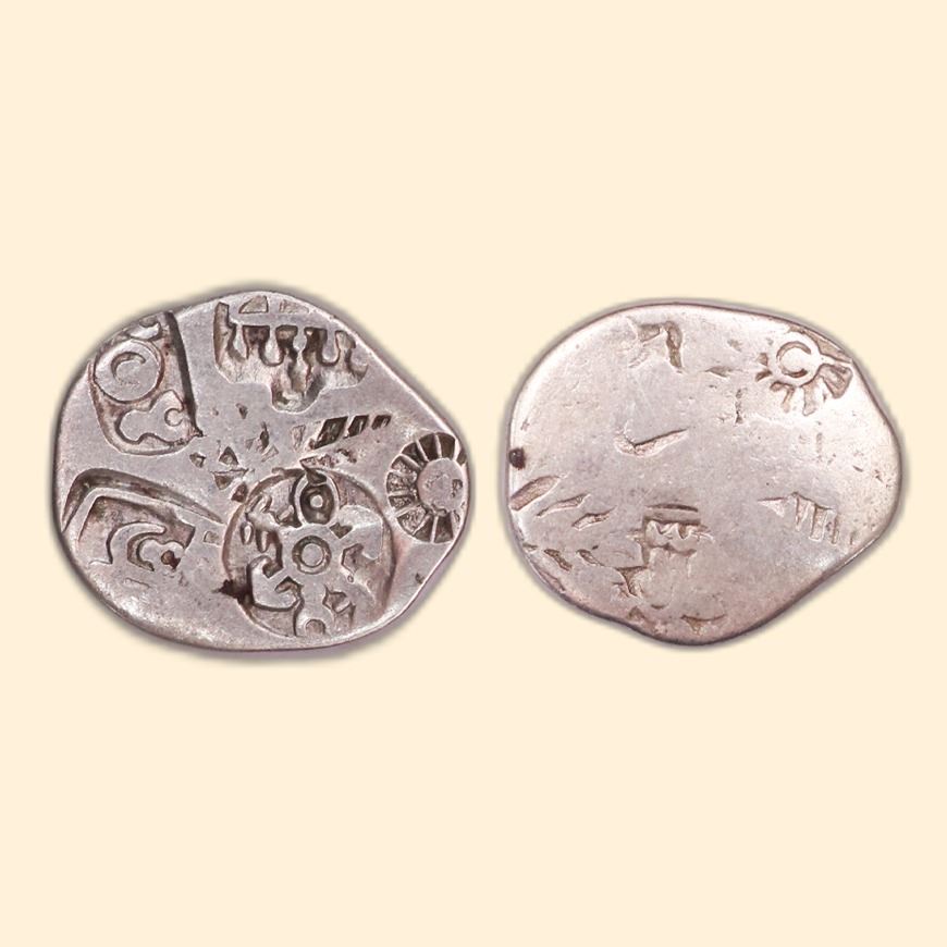 Archaic Coinage, Punch Marked, Magadha Janapada (600-400 BC), G/H Series IV, Silver Karshapana, 2.90gms, Five symbol type, OBV: Sun, six arnmed, pellet within circle flanked by taurine, like a tree and geometric symbol, REV: Banker marks. Extremely Fine.