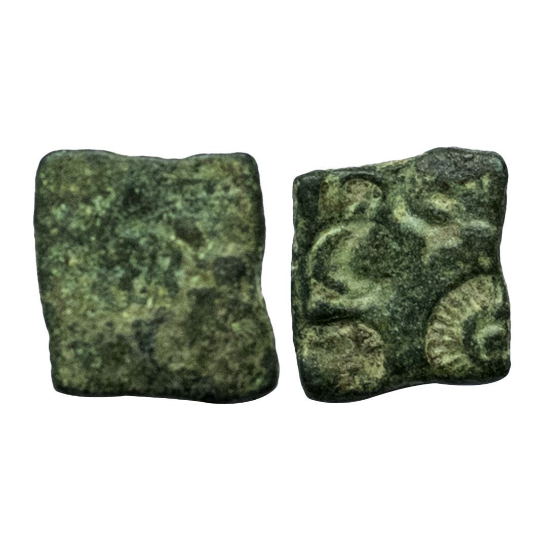 Punch Marked, Mauryan Period, Malwa Region, Copper Karshapana, 1.59Grms, Five symbol type, Obv: Sun, six armed, like a crescent, Mahakal and traces of fifth symbol, Rev: Blank. (Pieper # 290).Fine.