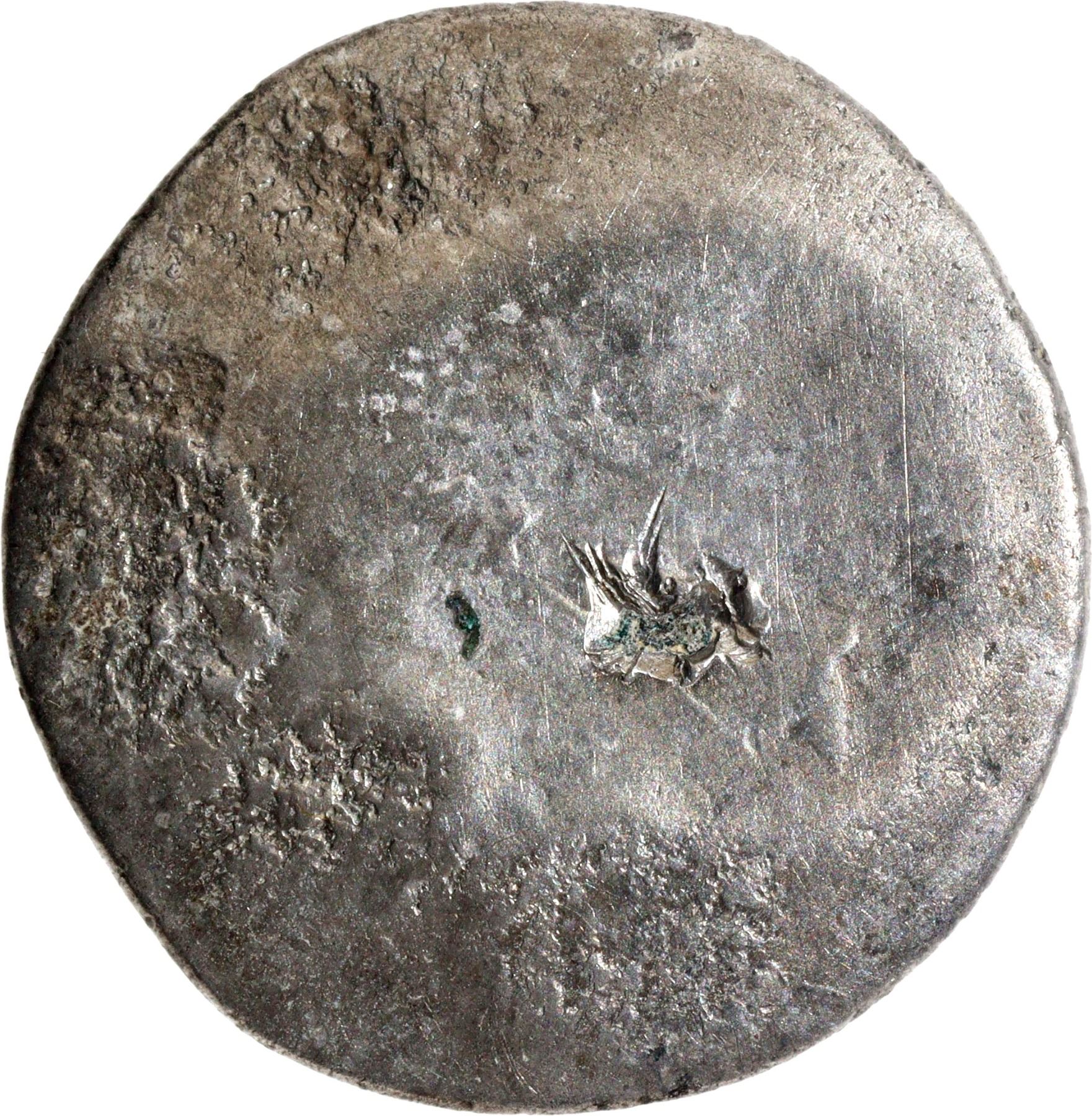 Punch Marked Coin, Kashi Janapada (600-465 BC), Silver ½ Vimshatika (2½ Shana), Archaic period, Obv: a single composite geometrical symbol of a circle with a whorled design at center, other ancillary symbols around, Rev: uniface, 2.4g, 18.26mm, (Unlisted in Rajgors/Hardekar # KA 261), about extremely fine, Extremely Rare.