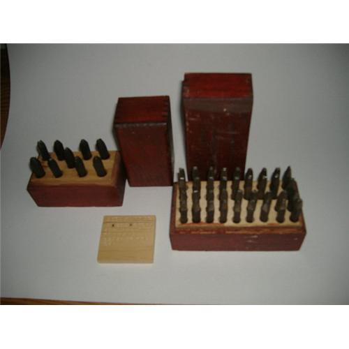 The antique boxes are dovetailed and stained red. The number stamp is 2 5/8" long,the alphabet stamp is 2 3/8".