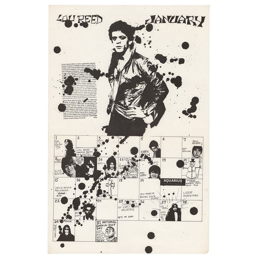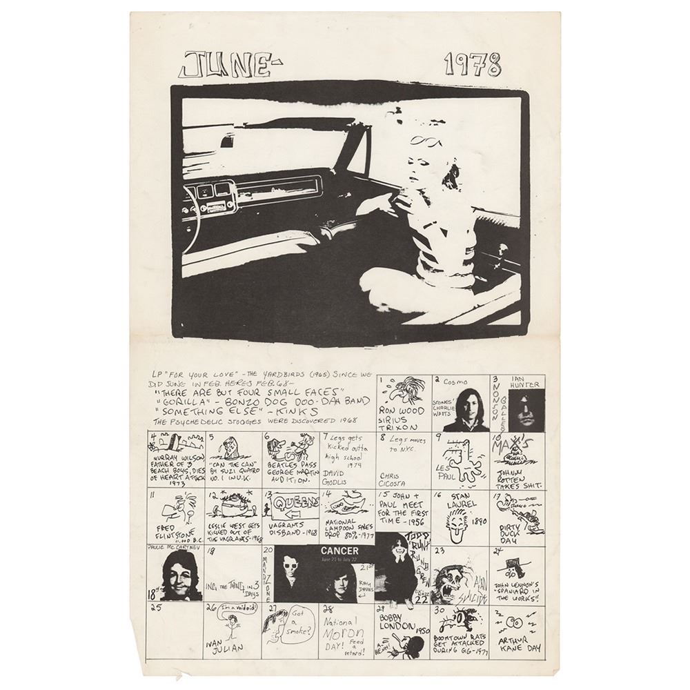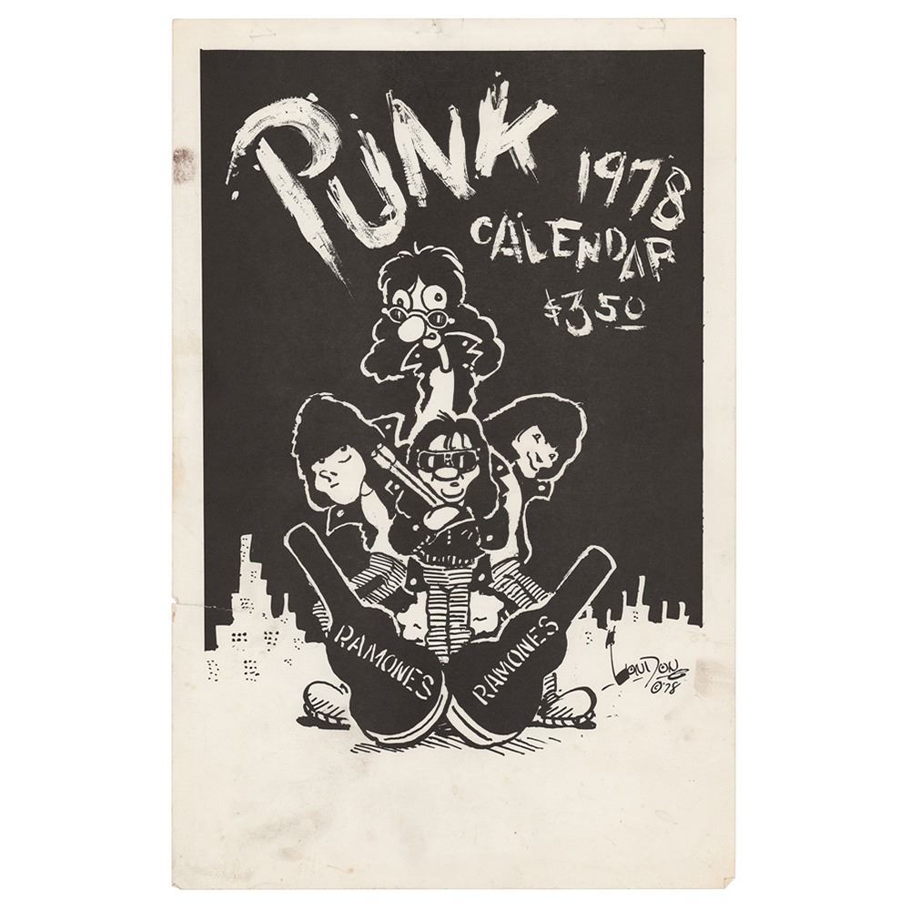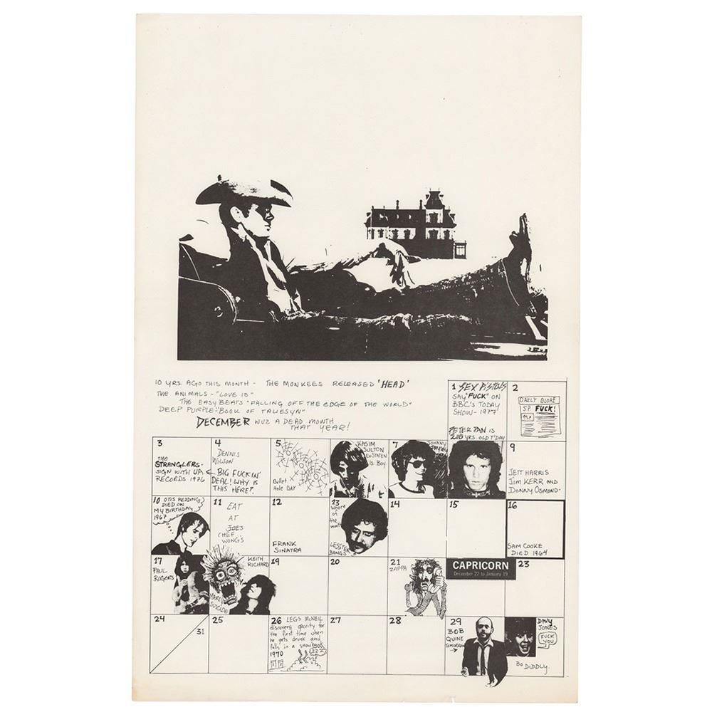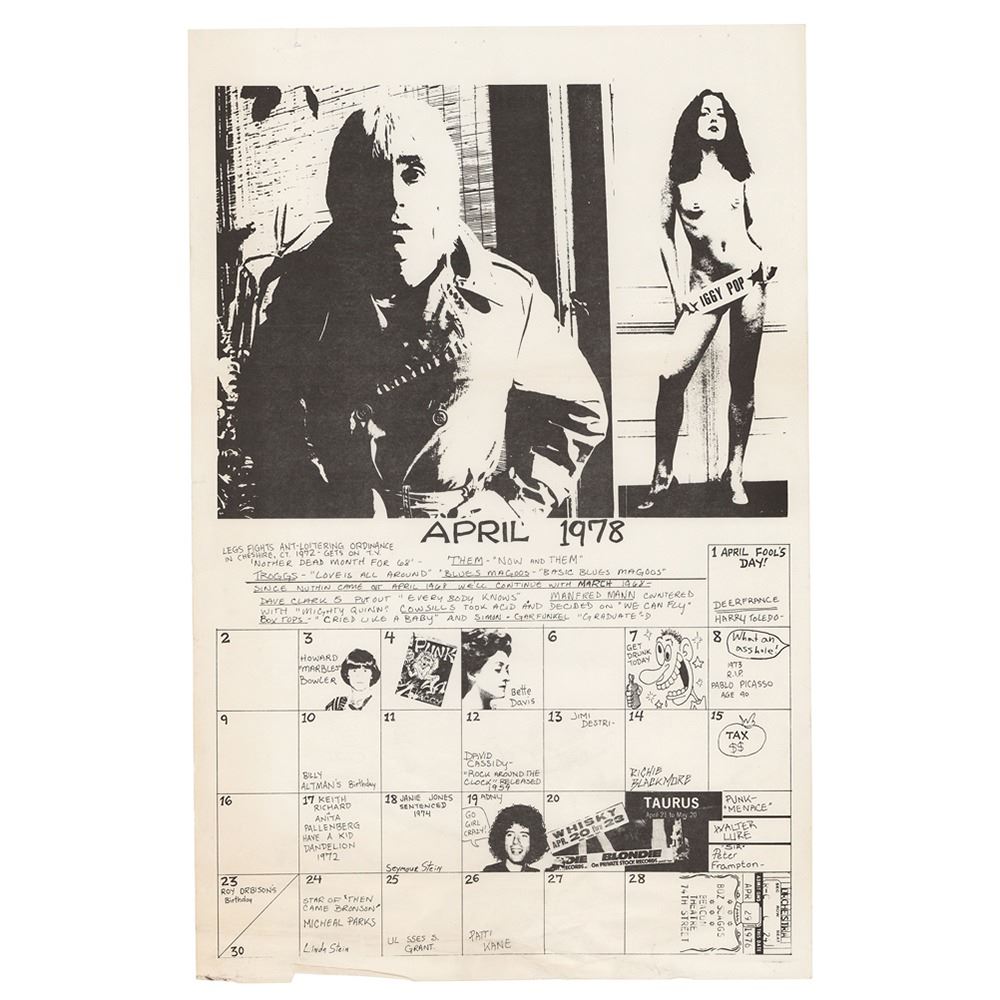 Nearly complete rare original “1978 Punk Calendar†issued by Punk Magazine, 12 pages, 11 x 17, with the front cover featuring a caricature of the Ramones by underground artist Bobby London. Each month contains a variety of amusing trivia facts and birthday reminders, with the upper portion featuring a large music or entertainment-related image: Lou Reed (January), James Cagney and the Dead End Kids from Angels with Dirty Faces (February), Suicide (March), Iggy Pop (April), Debbie Harry (June), Bay City Rollers (July), Paley Brothers (August), three kids with 45 records (September), Richard Hell (October), Dead Boys (November), and James Dean (December). May is missing, as is the calendar’s closing credits page with Our Gang image. Some dates bear pencil notations. In very good to fine condition, with some creasing, soiling, and edge tears.