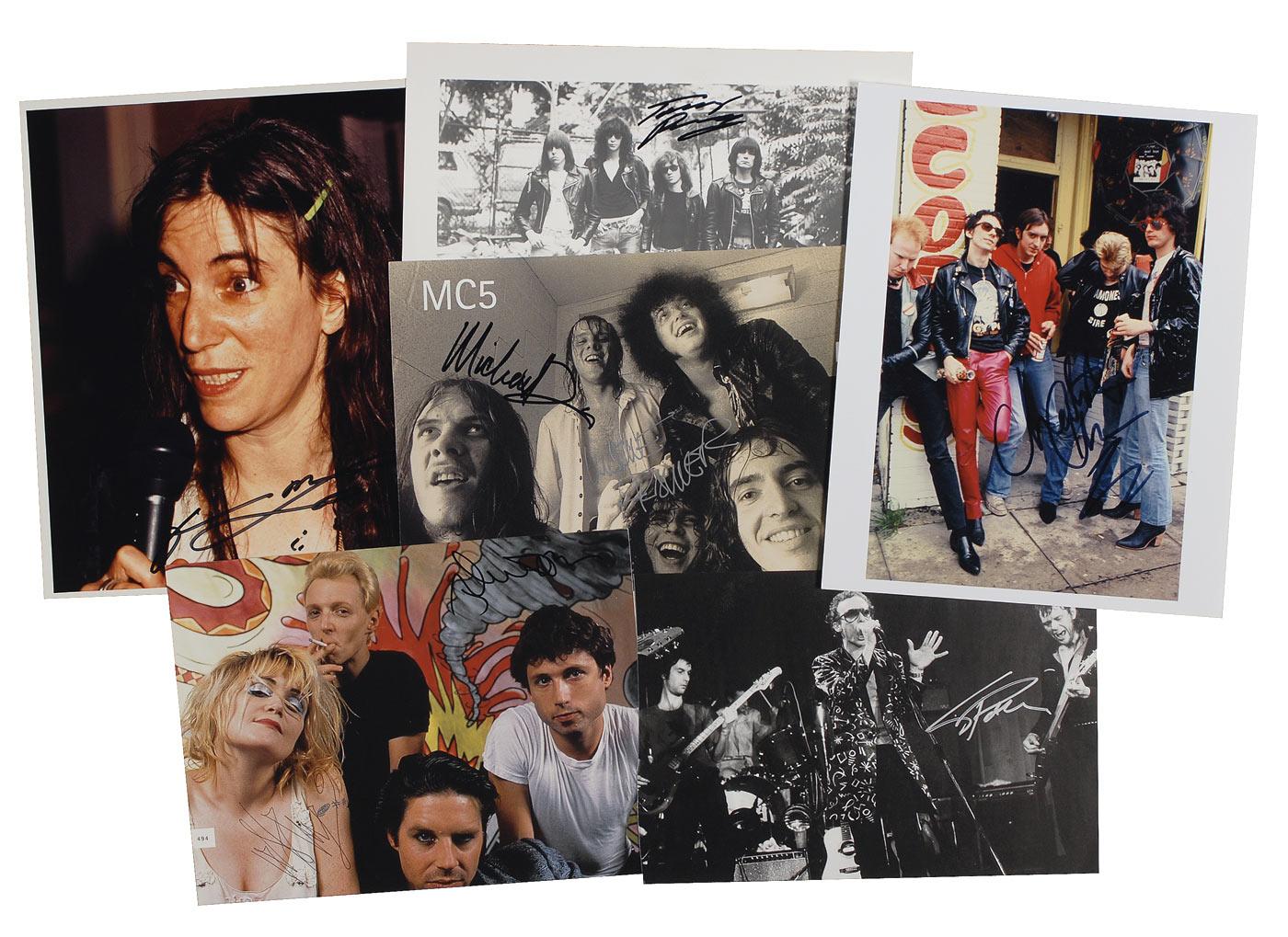 Six items: three 8 x 10 or 10 x 8 photos and three approximately 9.25 x 7 images removed from publications, each signed by at least one punk rocker. Signers are: Patti Smith, Tommy Ramone, Cheetah Chrome, Wayne Kramer and Michael Davis, Graham Parker, and John Doe and Exene Cervenka. In overall fine condition.