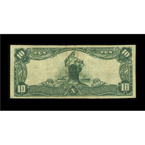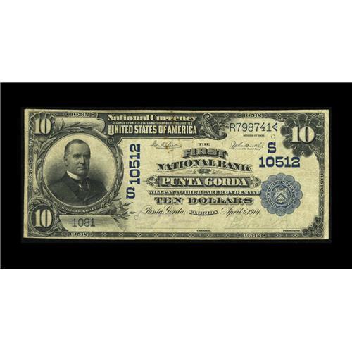<B>Punta Gorda, FL</B></I> - $10 1902 Plain Back Fr. 631 <B>The First NB</B></I> Ch. # (S)10512<BR>This is one of a mere four notes documented in the census for this one national bank county. Of the recorded quartet, this is the only note to ever go under the gavel before and that was nearly ten years ago. This bank is just plain rare and destined to remain so. The purple stamped signatures are light, while a paper clip rust outline is noticed at top center. <B>Fine.</B></I><BR><BR><b>Shipping:</b> Coin/Currency (<a target="_blank" href="http://www.heritageauctions.com/common/shipping.php">view shipping information</a>)