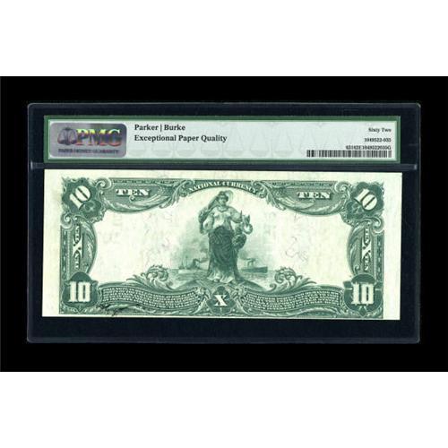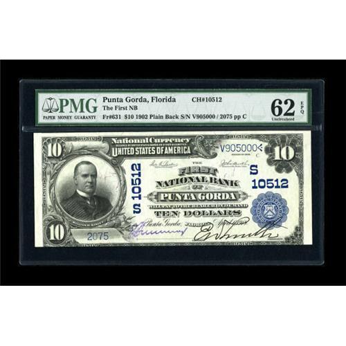 <B>Punta Gorda, FL</B></I> - $10 1902 Plain Back Fr. 631 <B>The First NB</B></I> Ch. # (S)10512<BR> An incredible note which is one of the highlight items in the Sunshine State Collection. It comes from the only bank to issue in this Charlotte County community, and is new to the census, which now totals a meager five notes. All save one have been closely held for years, with the lone example that has appeared on the market during the past decade realizing $16,100 in last year's FUN auction (against a pre-sale estimate of $5000-7500) despite grading only Fine and displaying a rust stain. None of the four other notes known from here grade better than Fine, but this piece, which has never been offered at public sale and has spent the last two decades ensconced in this collection, grades an amazing PMG <B>Uncirculated 62 EPQ, </B></I>a grade that would certainly be even higher were the bottom margin not slightly trimmed into the design. Any estimate here is simply a guess, as no example from here even close to this in grade has ever been available to collectors before this evening. Track and Price values this note at between $37,500 and $52,500, and we would not be at all surprised to see the hammer fall somewhere well within that range. <BR><I>From The Sunshine State Collection.</B></I><BR><BR><b>Shipping:</b> Coins & Currency (<a target="_blank" href="http://www.heritageauctions.com/common/shipping.php">view shipping information</a>)