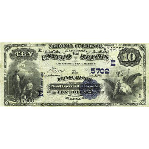 <B>Punxsutawney, PA</B></I> - $10 1882 Value Back Fr. 577 <B>The Punxsutawney NB</B></I> Ch. # (E)5702<BR>This is an unaccountably scarce bank in large size, with the census standing at just four such examples. This piece is new to that count, and is the sole Value Back reported from here as well. Pleasing <B>Fine-Very Fine.</B></I>