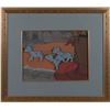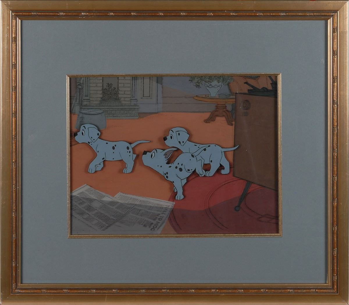 (Walt Disney Studios, 1961) Fantastic original production cel and production background from 101 Dalmatians featuring three puppies in the famous living room scene where the dogs watch TV. The cel is placed on a hand-painted production background. Total character image measures 11.5 x 5, with a mat opening of 14 x 11. Framed to an overall size of 24 x 21. In fine condition. A fabulous cel with beautiful large full character figures against a recognizable original production background. Oversized. Please contact RR Auction for a shipping quote.