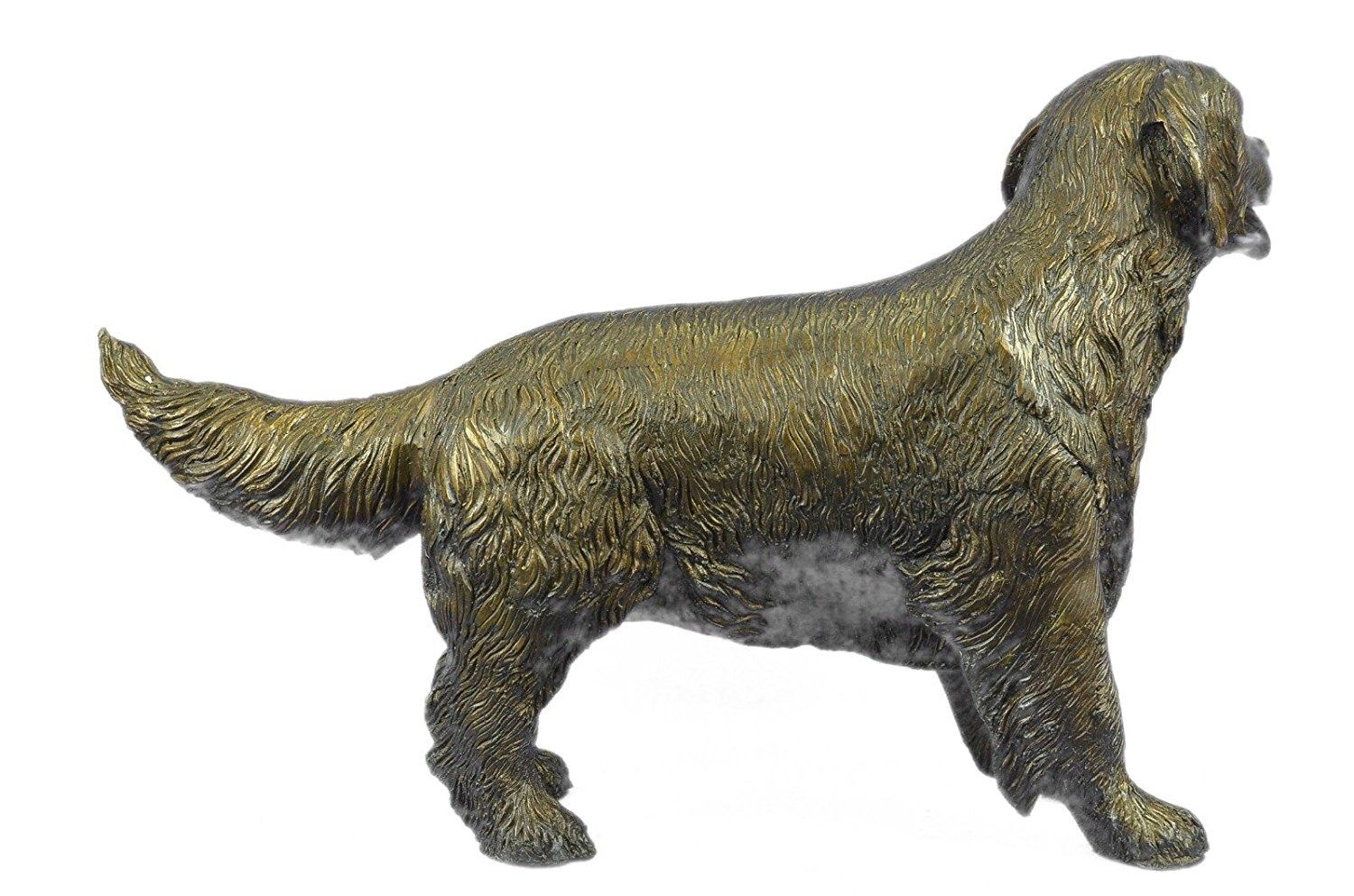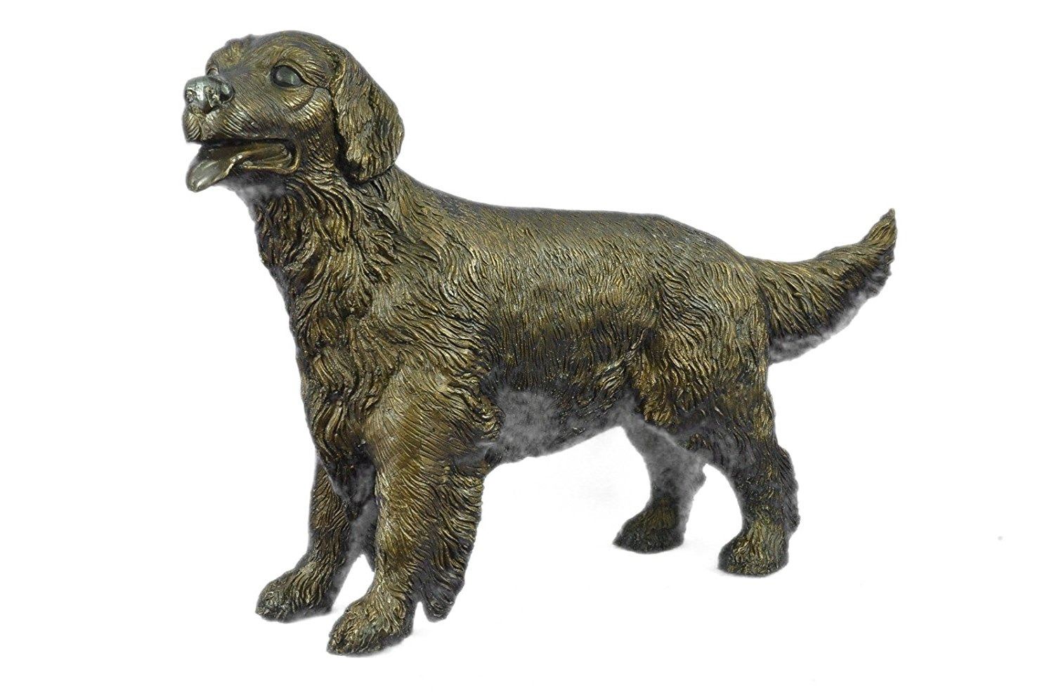 This is an adorably accurate statue of a young retriever dog. These are energetic, lovable, wellmannered, intelligent dogs with a great charm. They are easily trained, and always patient and gentle with children. Charming, devoted and selfassured, they are a popular family dog. This one stands patiently and looks up excited with its tongue slightly out. Its hair is detailed with fine lines, getting longer around back of its legs. Its tail stands out straight and its eyes are bright and opened big showing her eagerness. Handmade using the Lost Wax Method with a two tone brown patina. Bronze: Height 26 X Width 17 inches. Weight: 25 LBS. Inventory: 6858420M10086