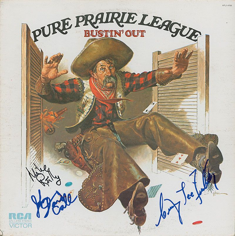 Bustin’ Out album signed on the front cover in blue felt tip by Craig Lee Fuller and John David Call and in black felt tip by Mike Reilly. In fine condition, with light ‘ring of wear’ to cover, some scattered edge wear, and a small tear to lower left corner tip. The record is not included.