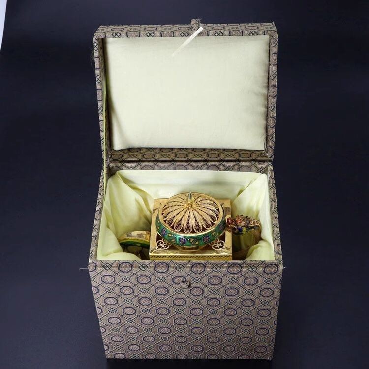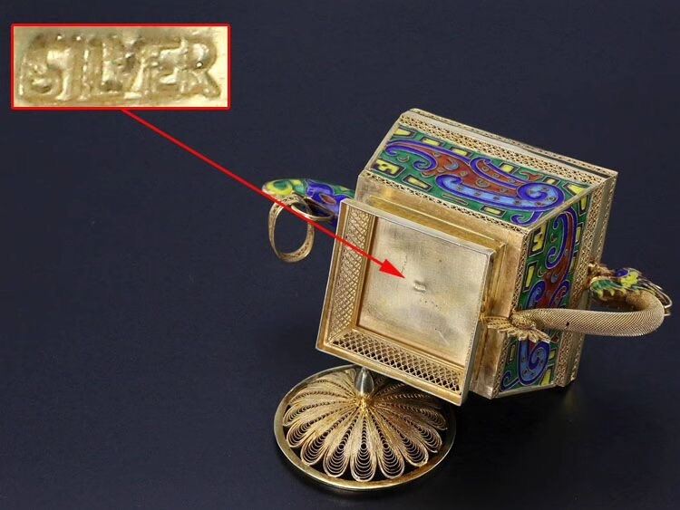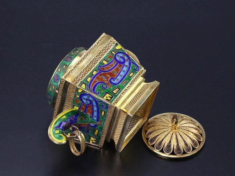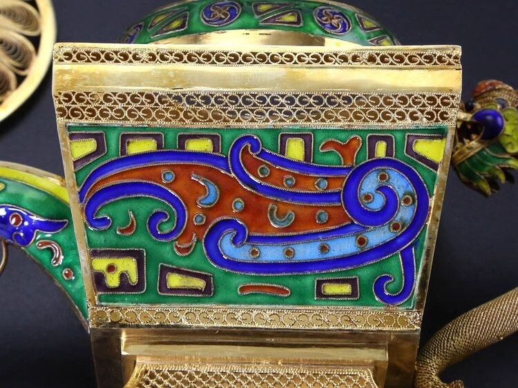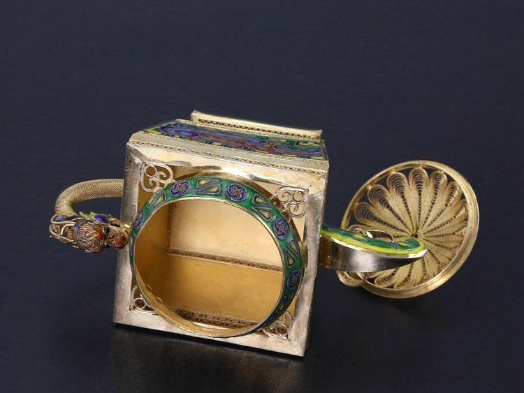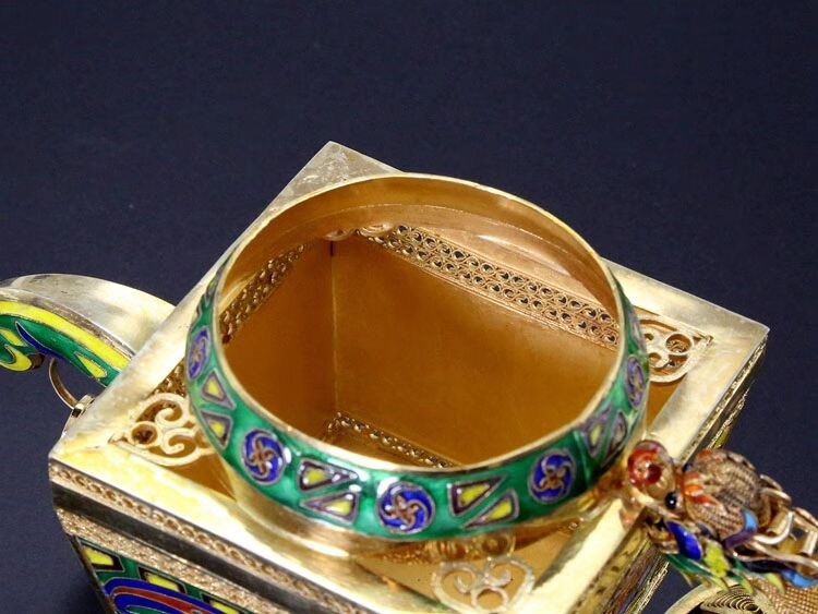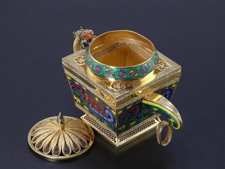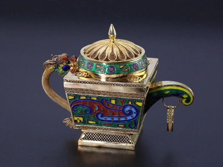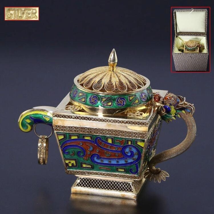 This pure silver gilded filigree cloisonné incense burner, designed in the shape of a teapot, is a masterpiece combining traditional craftsmanship and exquisite design. The silver framework is inlaid with delicate gold filigree and vibrant cloisonné enamel dragon patterns, showcasing superb craftsmanship. The dragon motif is vivid and symbolizes power and auspiciousness. The handle adds both aesthetic appeal and practicality, with the intricate golden details harmonizing beautifully with the silver material, making this incense burner a highly valuable work of art and a prized collectible.