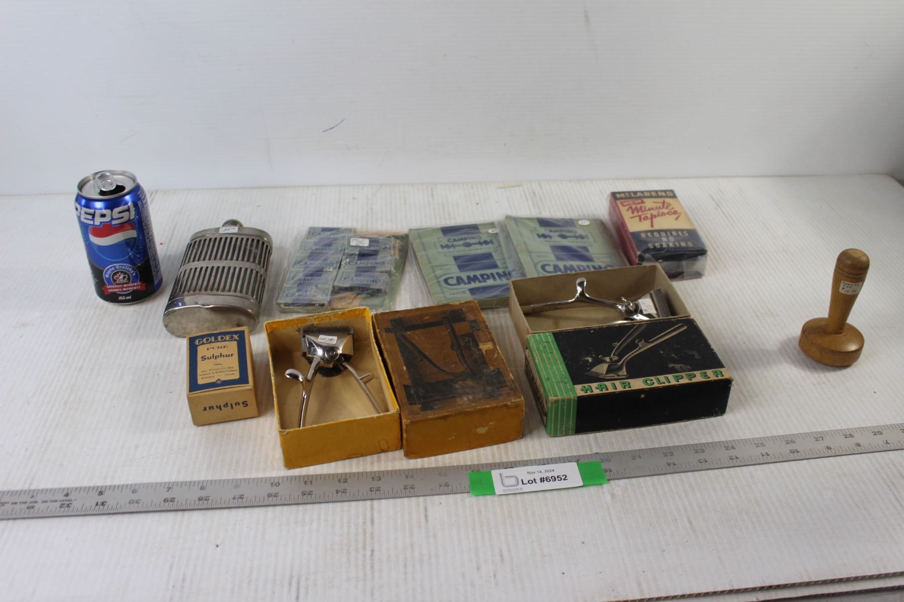 Pure Sulphur, (2) Hair Clippers, Razor Blades, Minute Tapioca, Flask, Pepsi Can